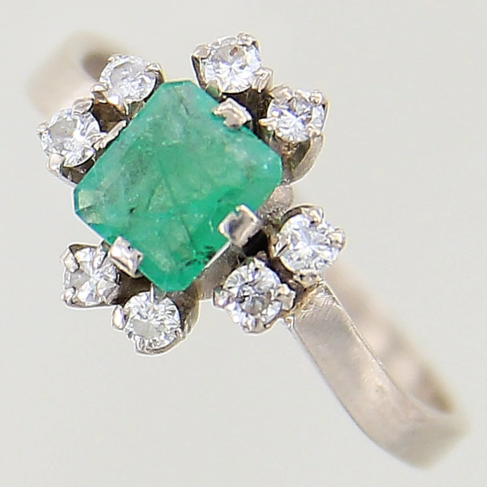 Ring med smaragd samt diamanter, 8 x ca 0,02ct, stl: 17, bredd: 2mm, vitguld, nagg på smaragd, klor med skador samt slitage, smaragd något lös, 18K Vikt: 2,6 g.