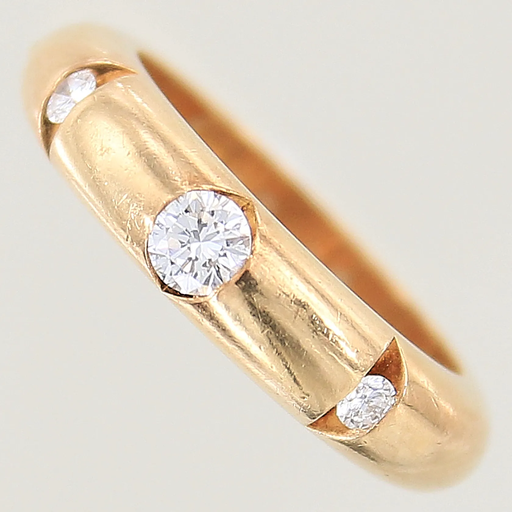 Ring med diamanter 1 x ca 0,22ct, 2 x ca 0,04ct, en av de mindre diamanterna är troligen syntetisk, stl 17¼, bredd 5mm, gravyr, 18K Vikt: 11 g.