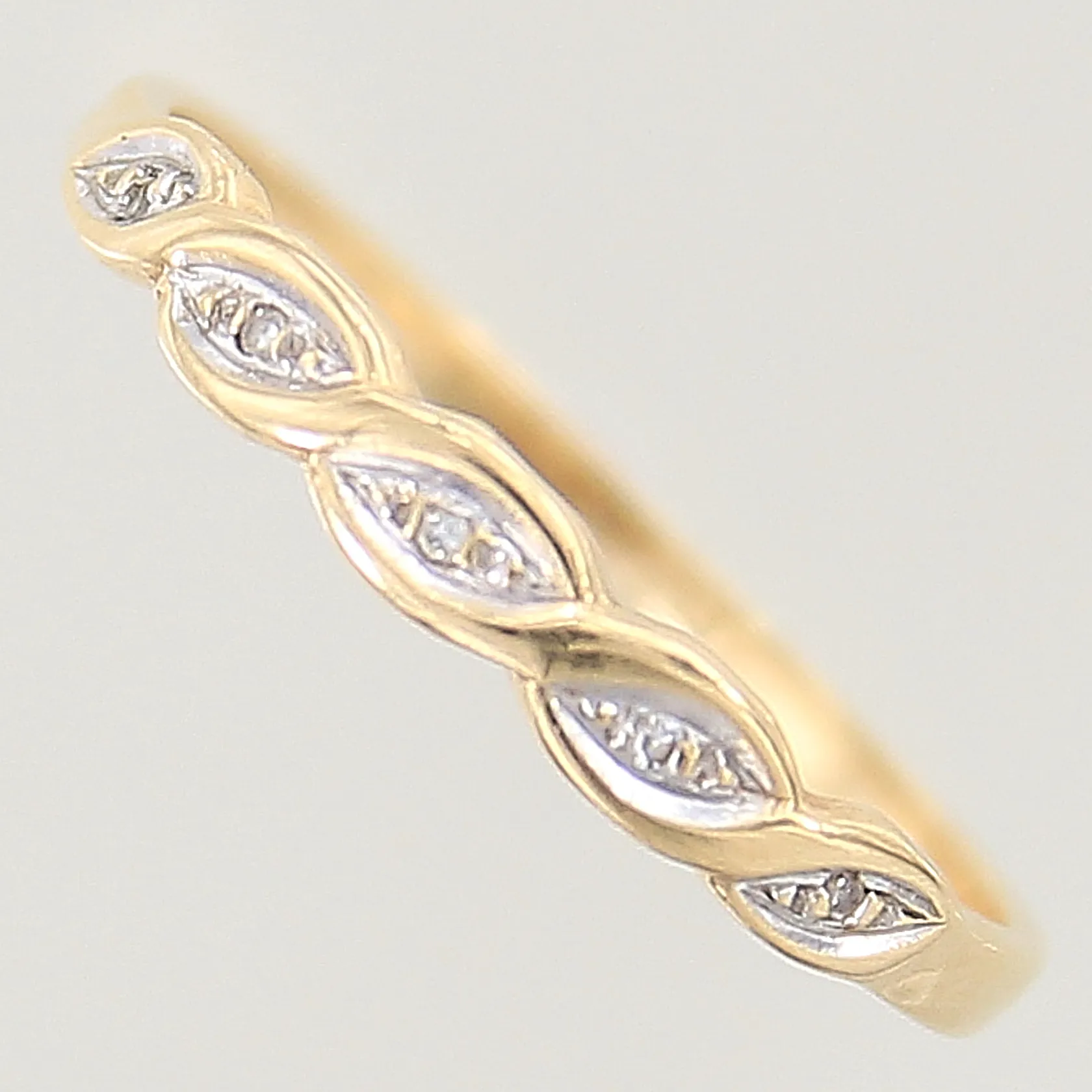 Ring med 8/8-slipade diamanter 5 x ca 0,005ct, stl: 17¾, bredd: 1,3-2,8mm, 18K Vikt: 1,2 g.