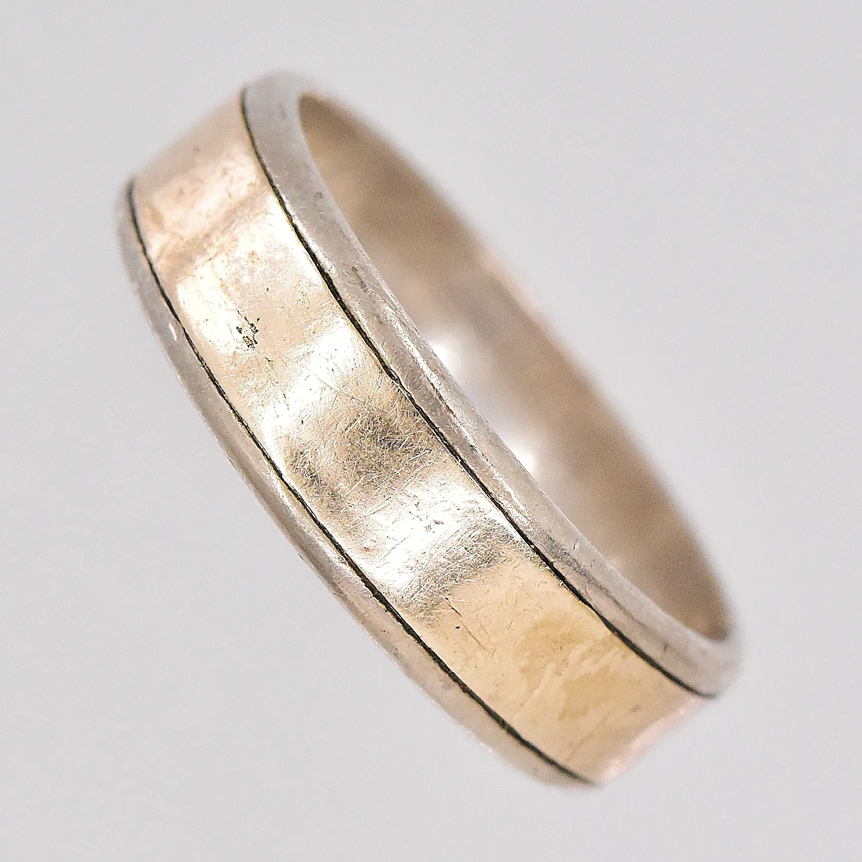 Ring från Wallin Gravyr O Guldverkstaden stl:19½ bredd 6,4mm, hack i skenan silver 830/1000 Vikt: 5,6 g.