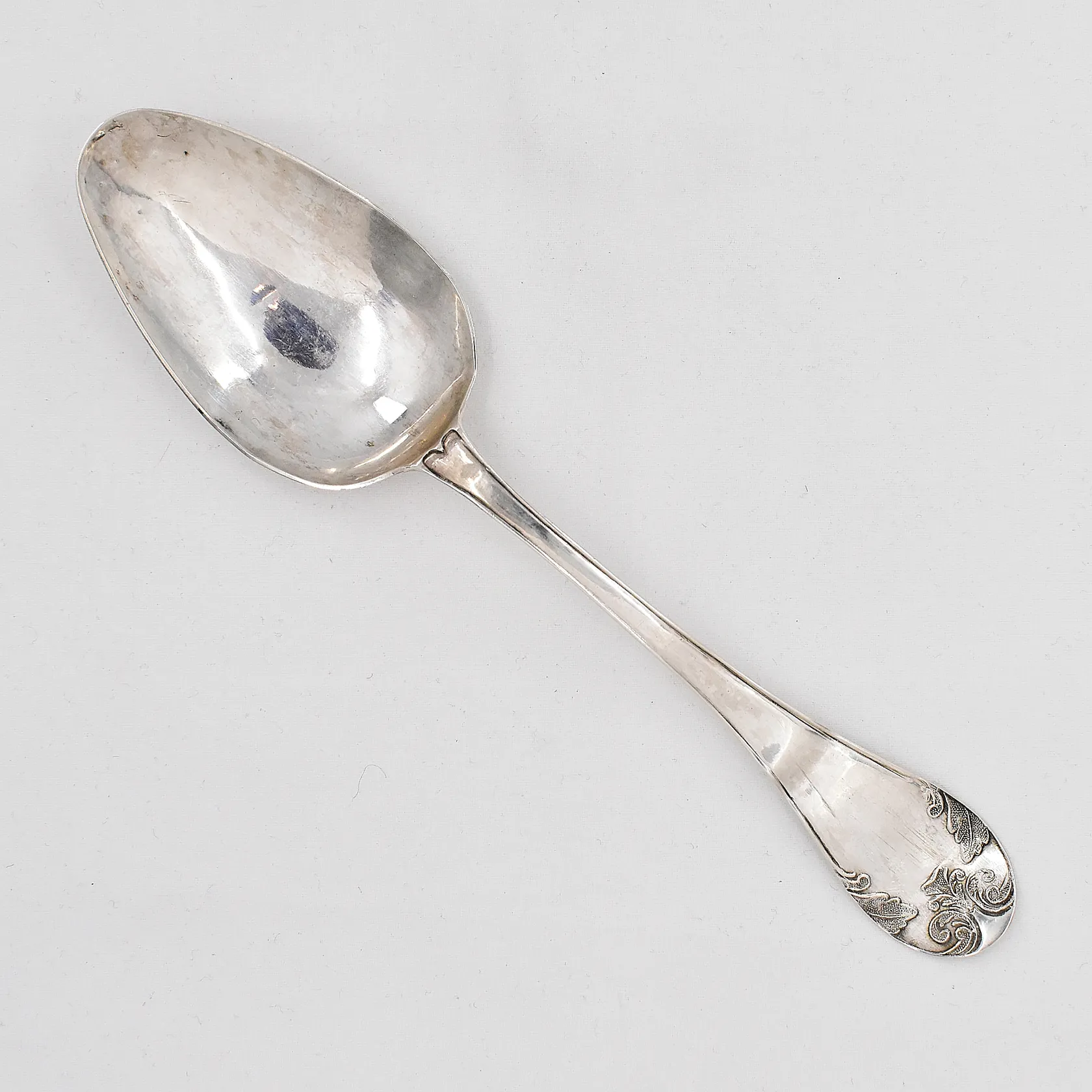 Matsked Gammal Fransk 20,5cm år 1848, defekter, gravyr, silver 830/1000 Vikt: 26,9 g.