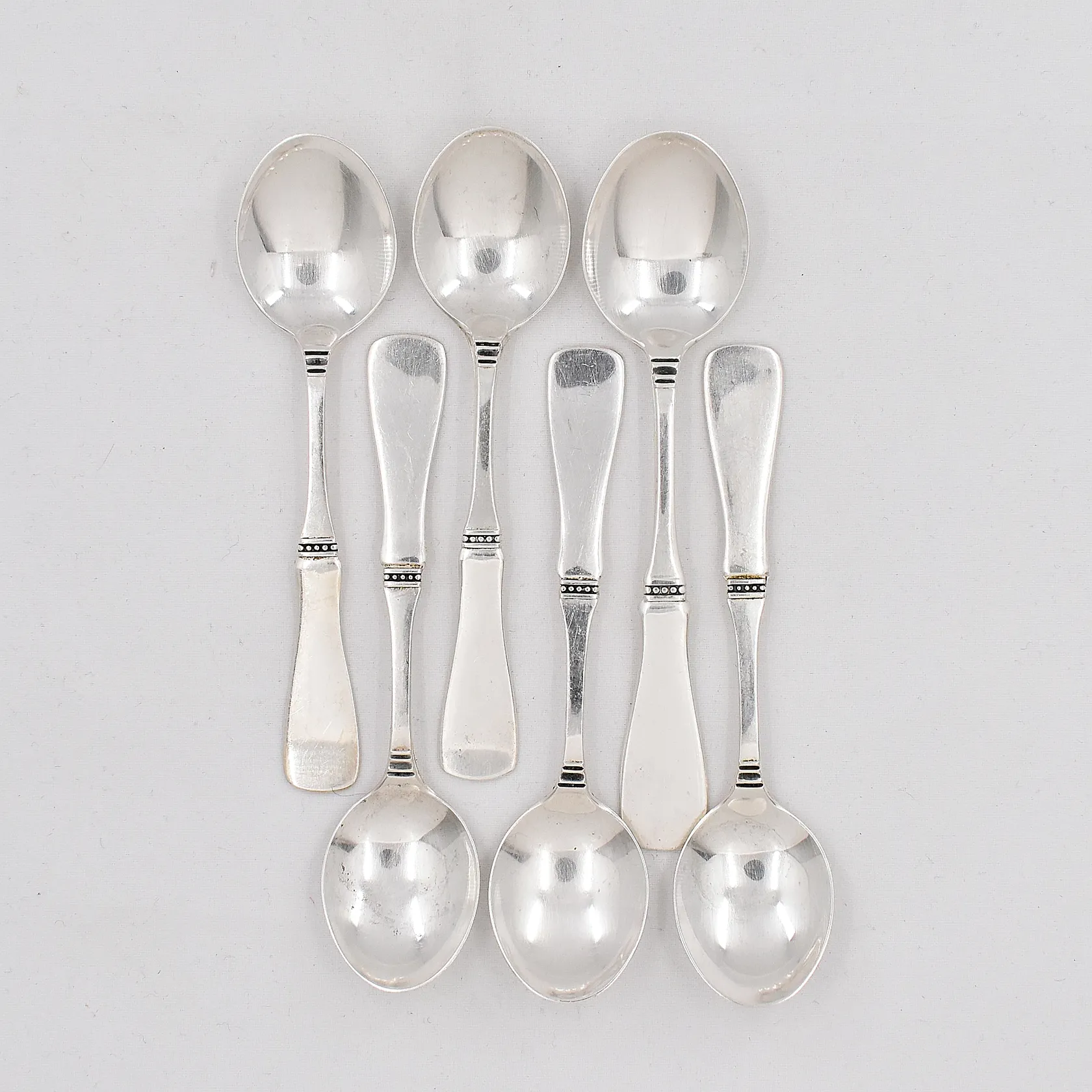 1 kaffesked 12cm 5 moccaskedar 11cm Uppsala, MGAB, silver 830/1000 Vikt: 73,2 g.