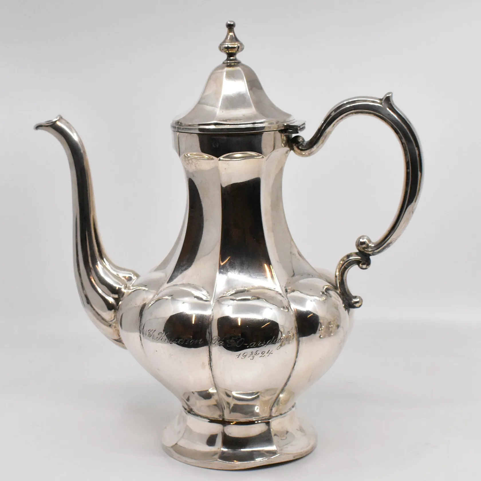 Kaffeservis, kaffekanna 27cm, gräddkanna 16cm, sockerskål 15cm, tillverkare Rothoffs Eftr Strängnäs, år 1923, personlig gravyr, ojämn botten på kaffekanna, silver 830/1000 Vikt: 1147,6 g.