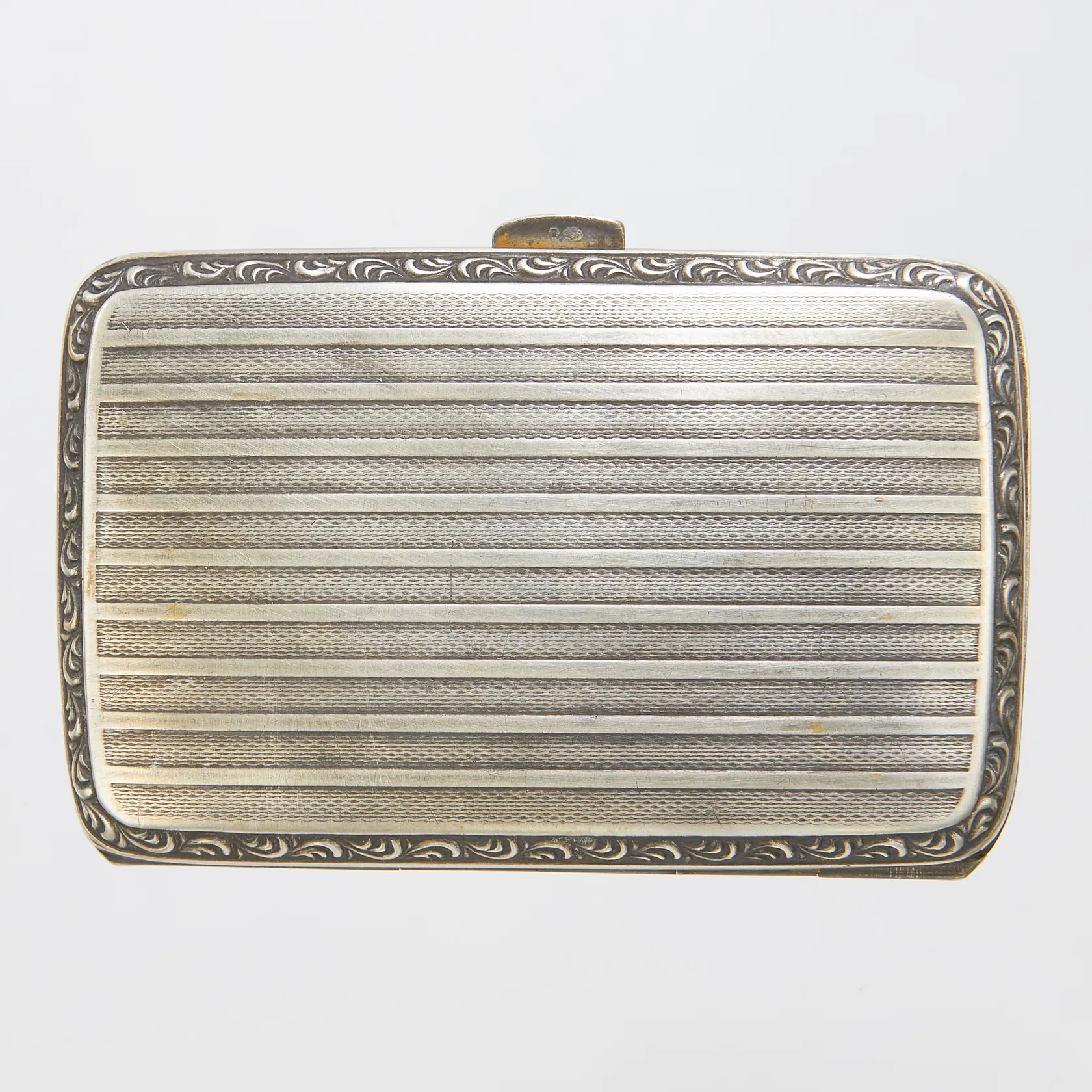 Etui med räfflad dekor samt förgylld insida, 80,2x51,5mm, missfärgat, repigt, bucklor, silver, 830/1000 Vikt: 36,4 g.