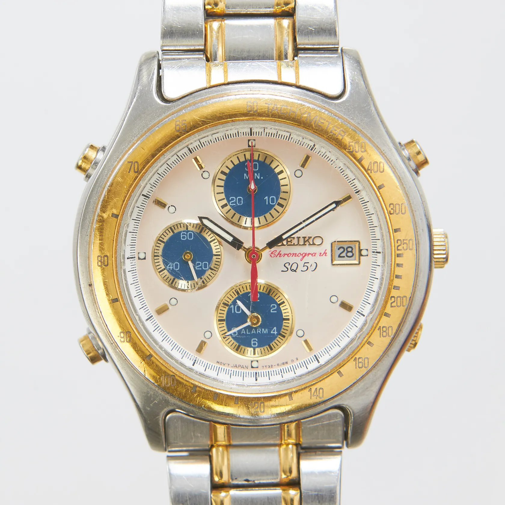 Armbandsur Seiko Chronograph SQ50 stål quartz 40mm, refnr 7T32-6G50, snr 5D2413, safirglas, datum, stållänk, viklås, repor på länkar, boett samt glas, inga tillbehör.