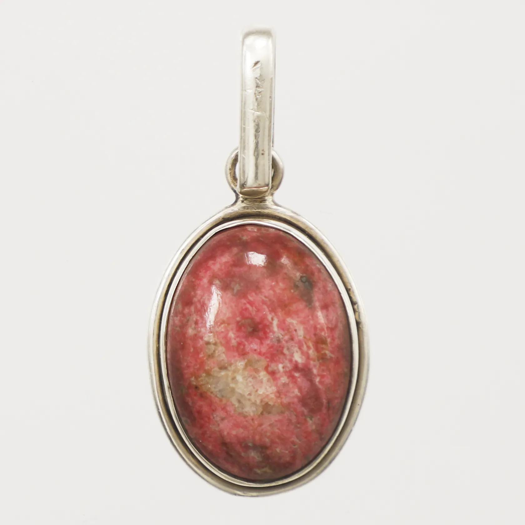 Hänge med rodonit, längd 33mm inkl ögla, bredd 15mm, 925/1000 silver Vikt: 4 g.