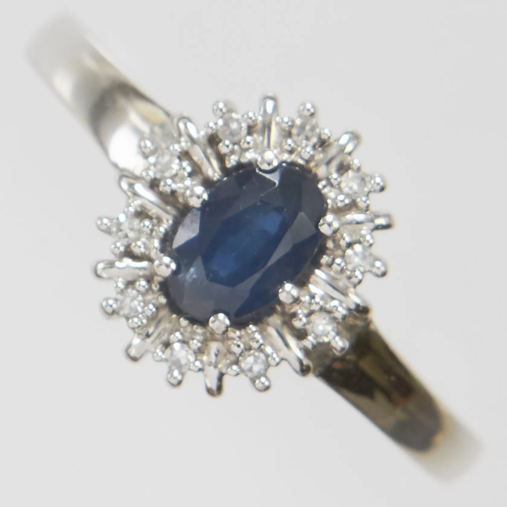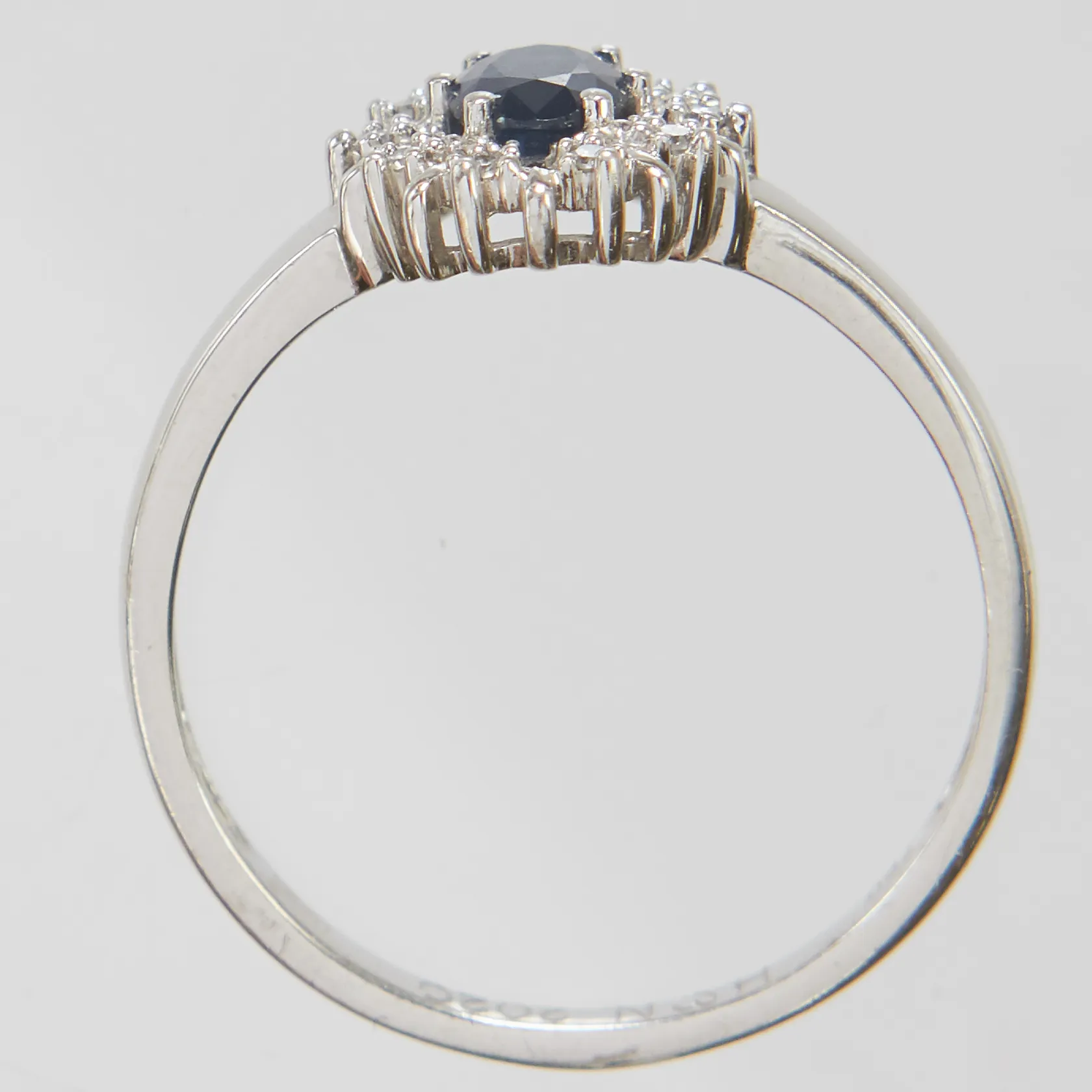 Carmoséring med safir samt diamanter 10xca0,005ct, stl18½, bredd 2-11mm, vitguld, GHA, gravyr, 18K Vikt: 3 g.