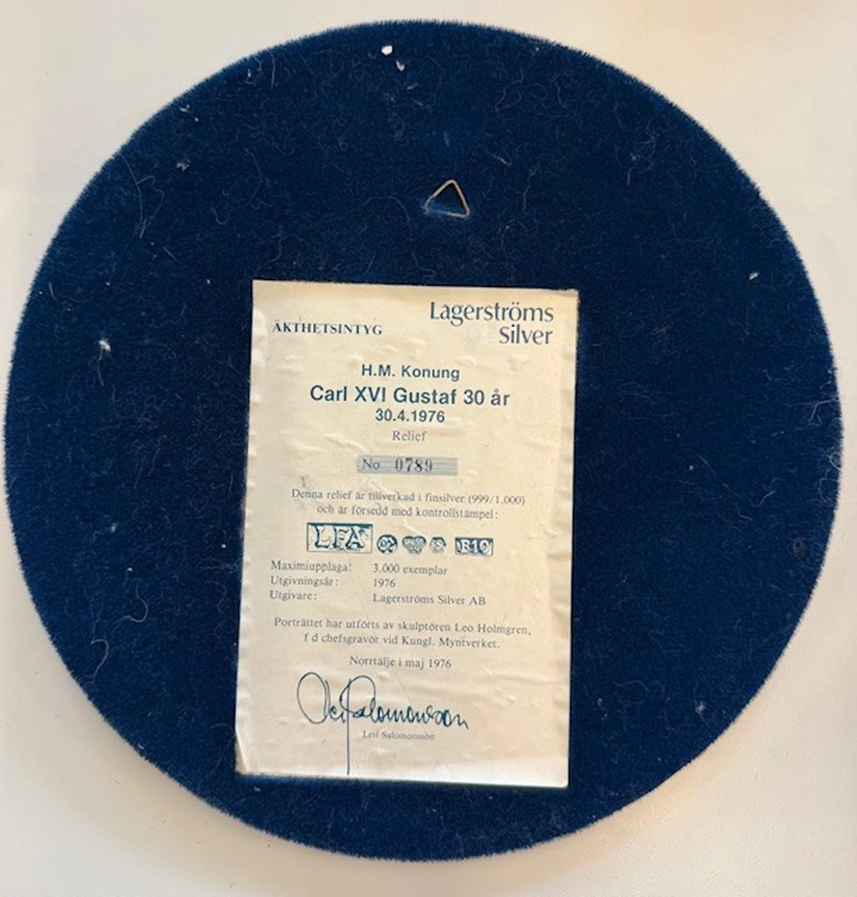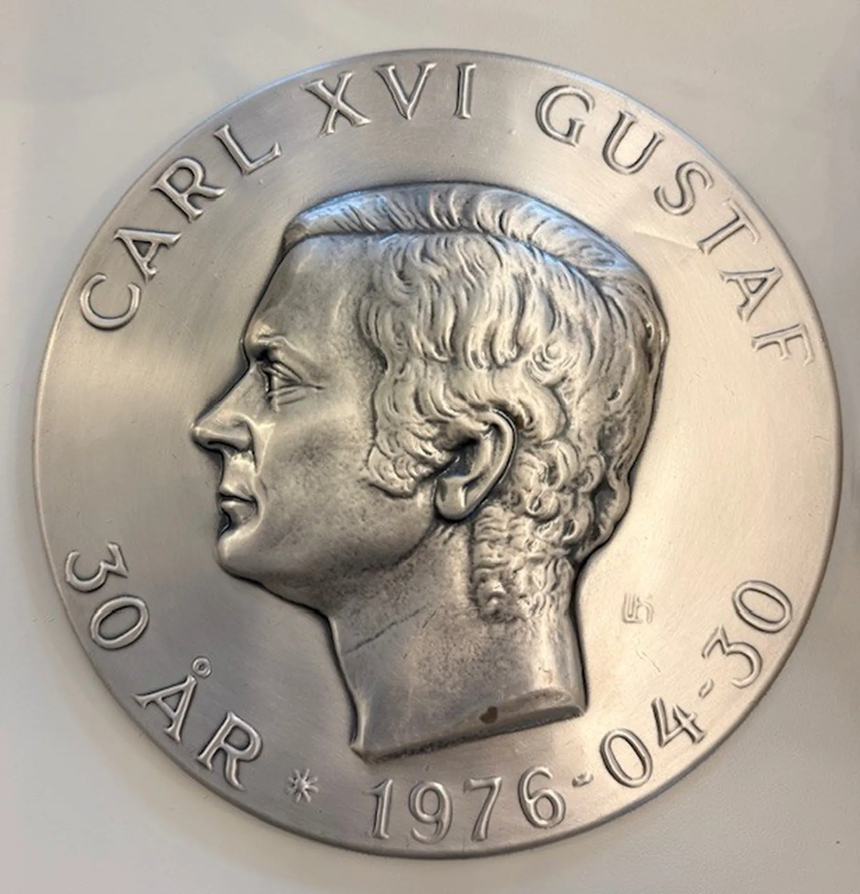 Väggrelief Lagerströms Silver, H.M.Konung Carl XVI Gustaf 30 år 30.4.1976, nr: 0789, 999/1000 bruttovikt: 368,7g Vikt: 368,7 g.