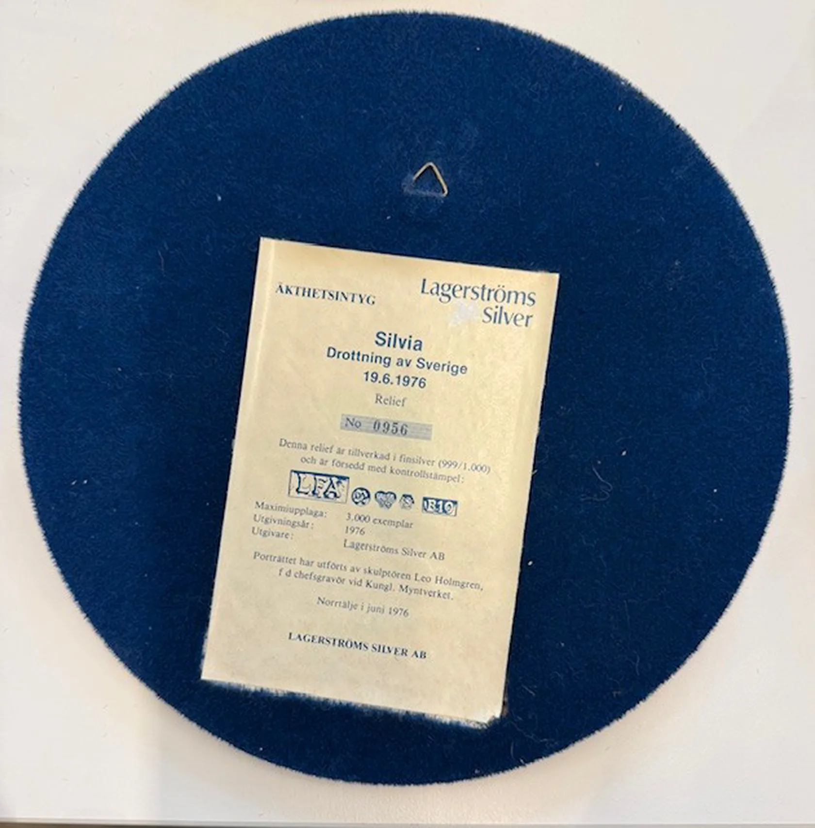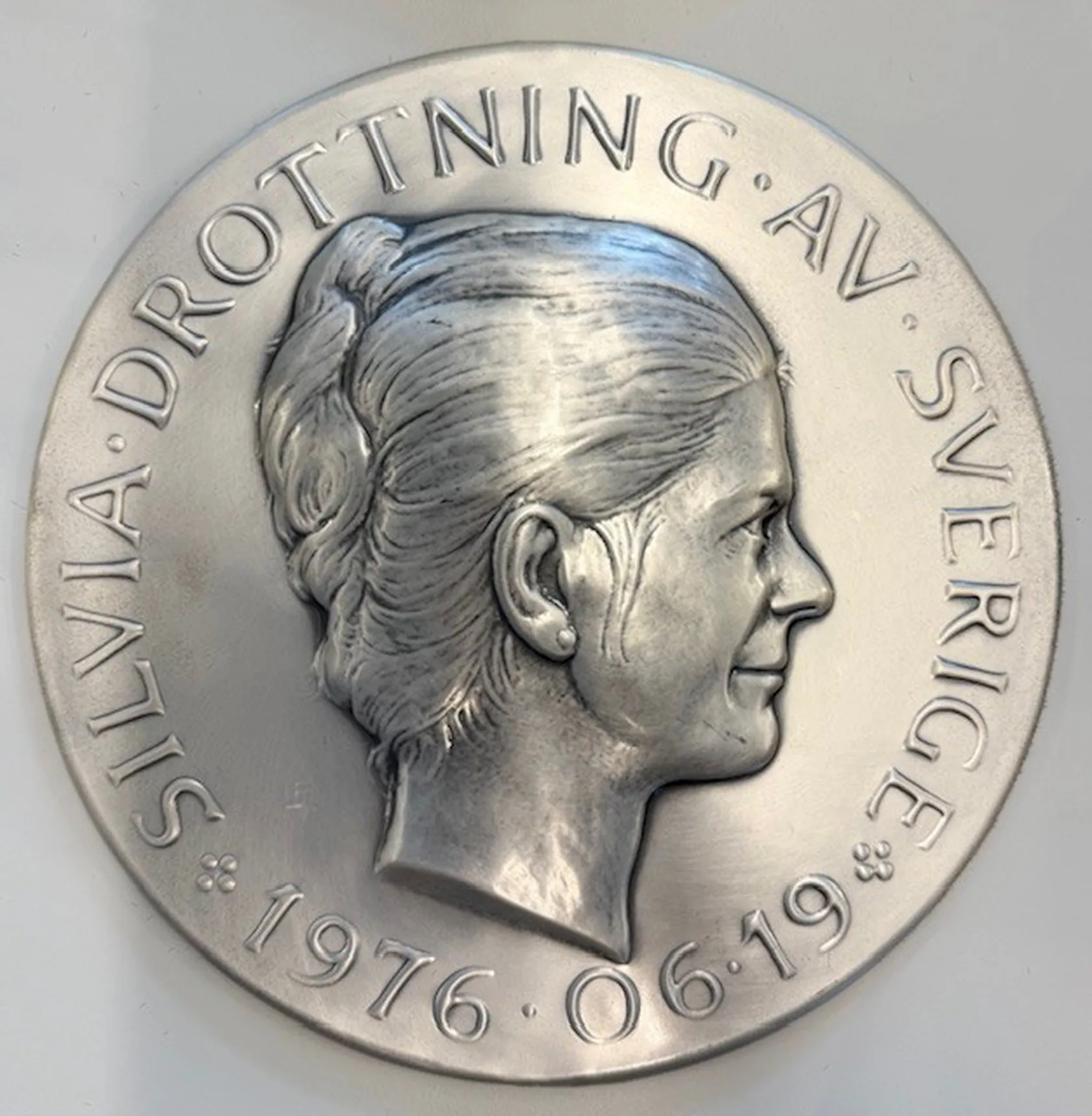 Väggrelief Lagerströms Silver, Silvia Drottning av Sverige 19.6.1976, nr 0956, 999/1000, i kartong, bruttovikt: 341g Vikt: 341 g.