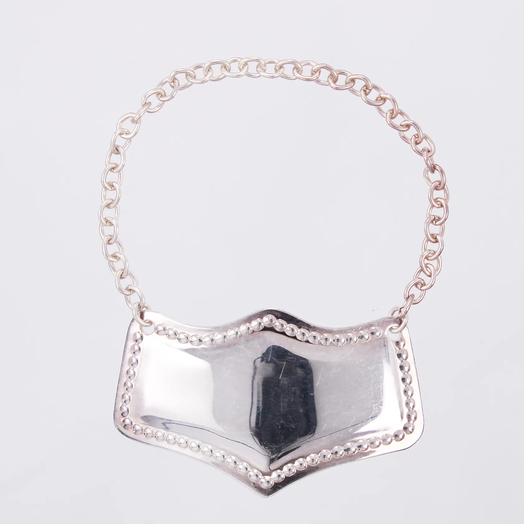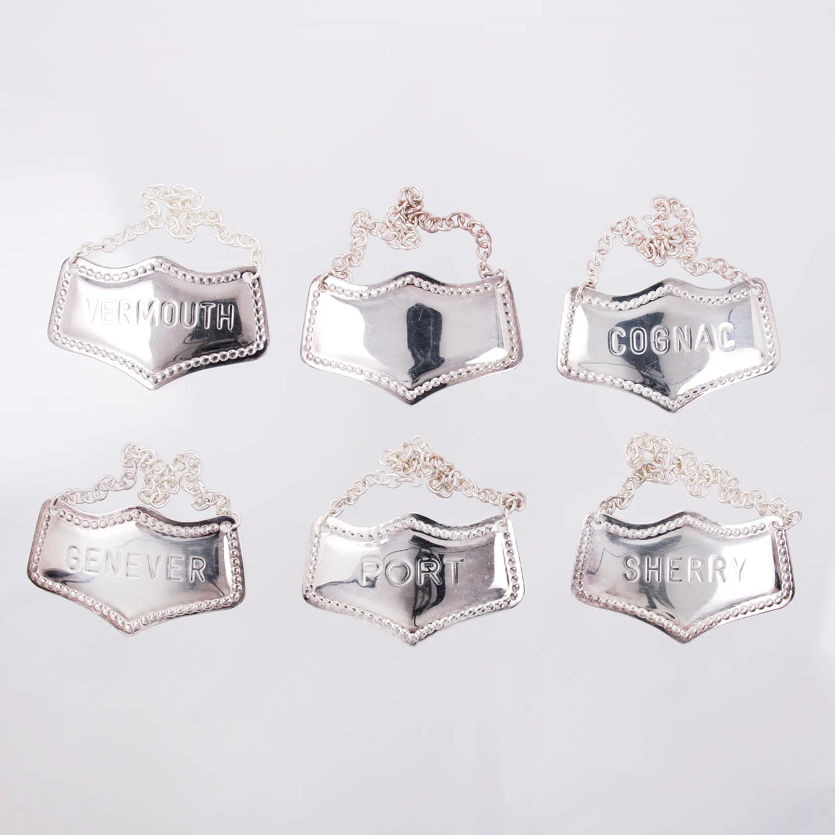 6 Flaskbrickor ( Varav en omärkt) Cognac Genever Vermouth Sherry Port, vitmetall