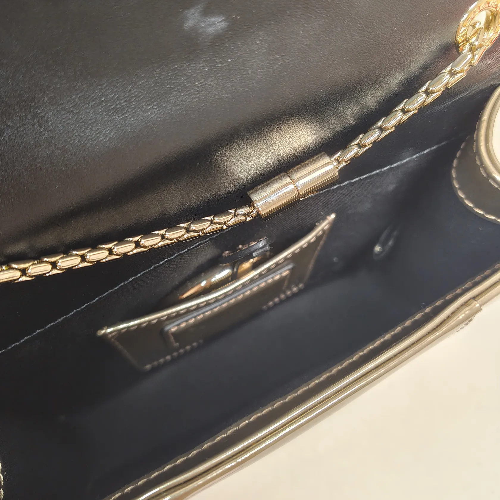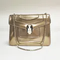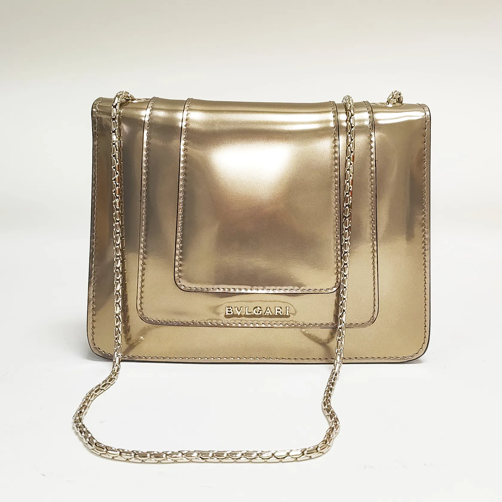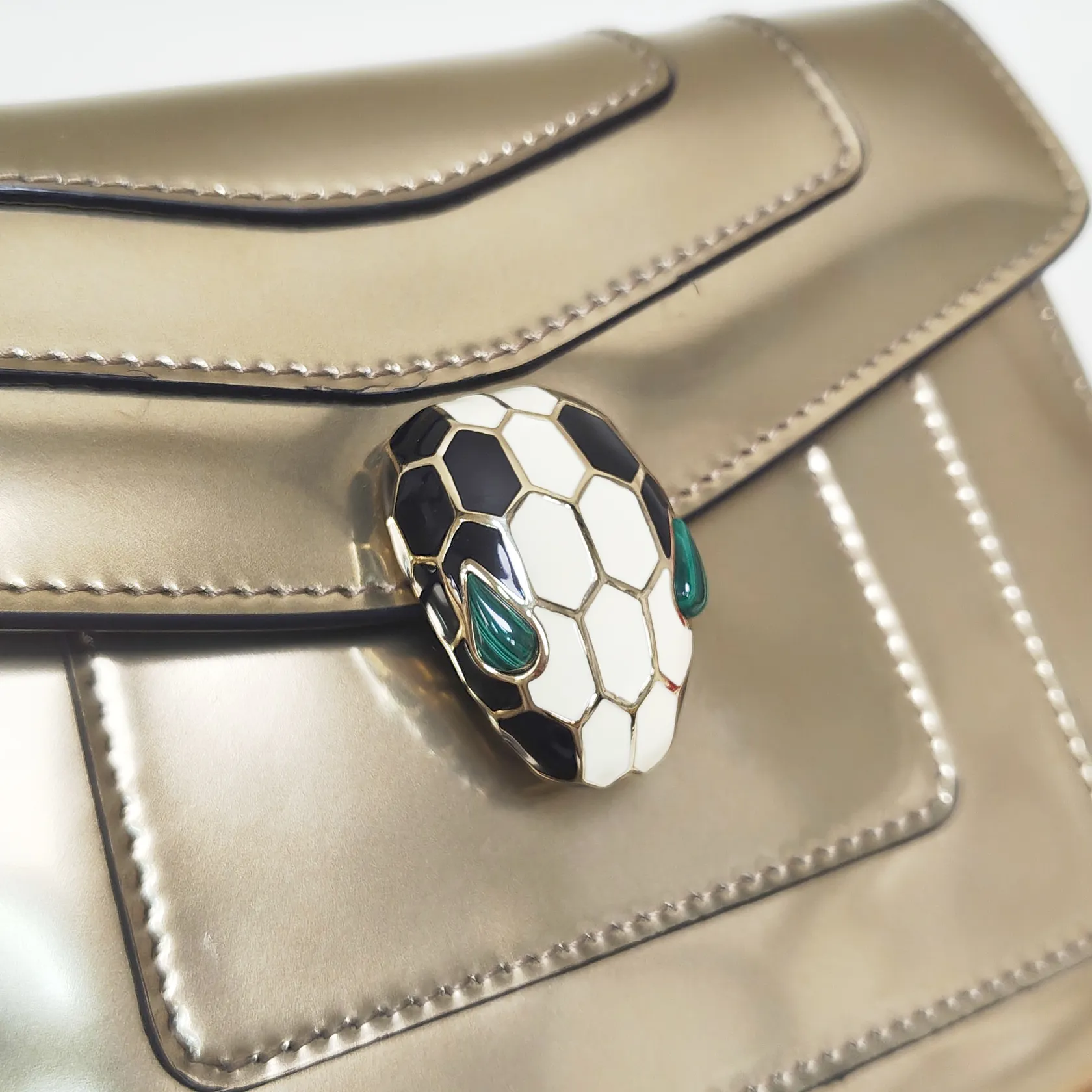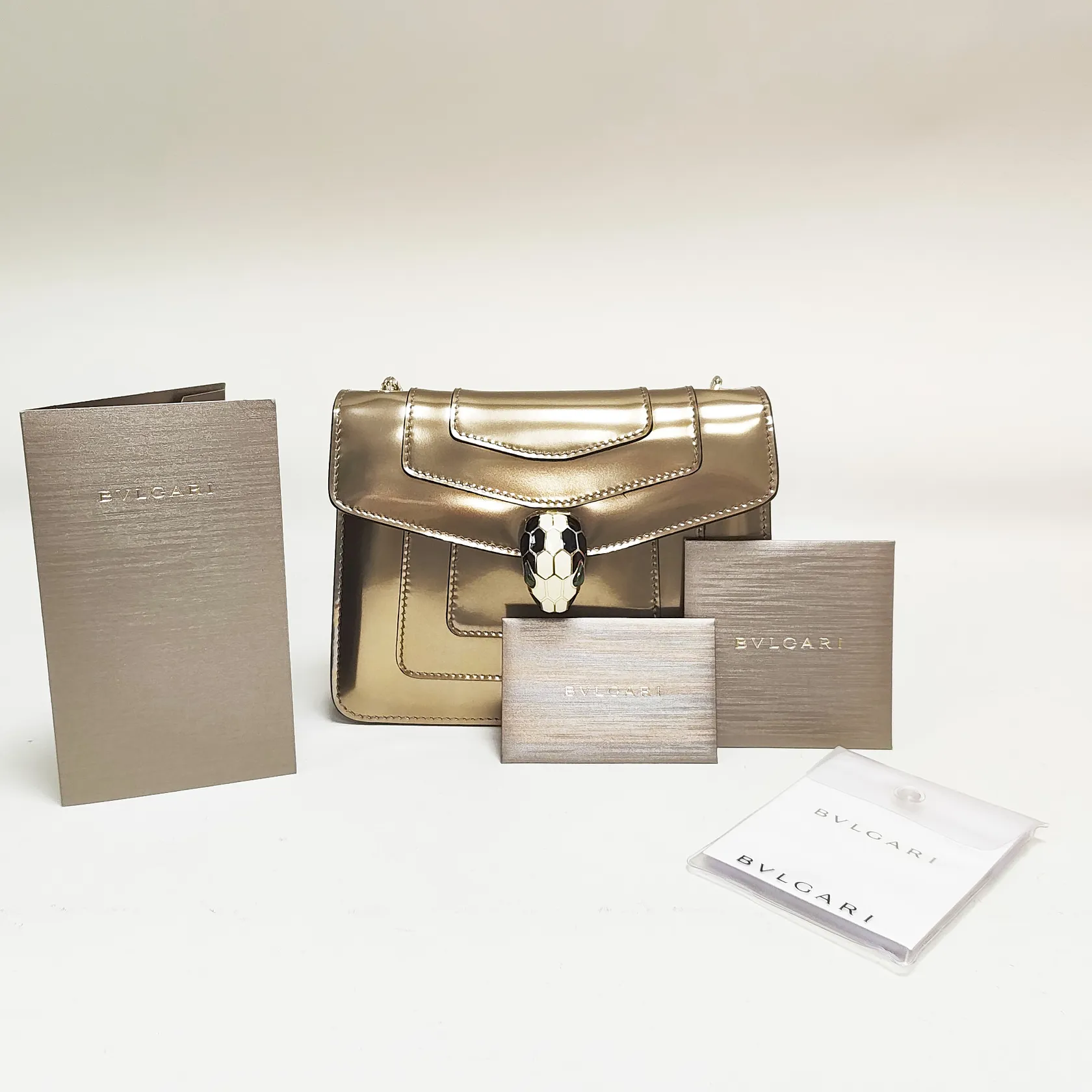 Väska BVLGARI Serpenti Forever, kalvläder med metallfinish, nr 2877051Y, mått 14 x 20 x 4,5cm, beslag i gulmetall, spegel, regnskydd, ej ifyllt certifikat, mindre märke, kvitto från Paris 2022, inga övriga tillbehör.