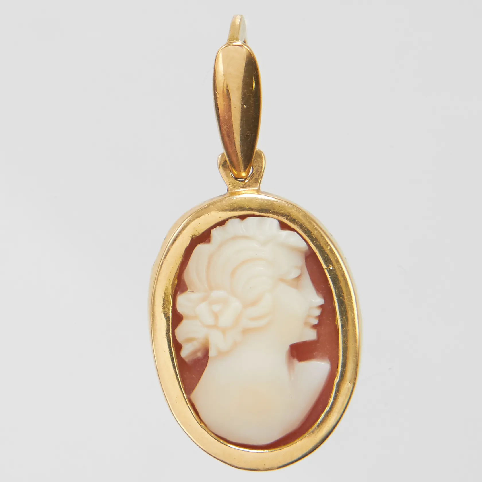 Hänge med snäckskalskamé, 26,7x12,6mm, 18K Vikt: 2,1 g.