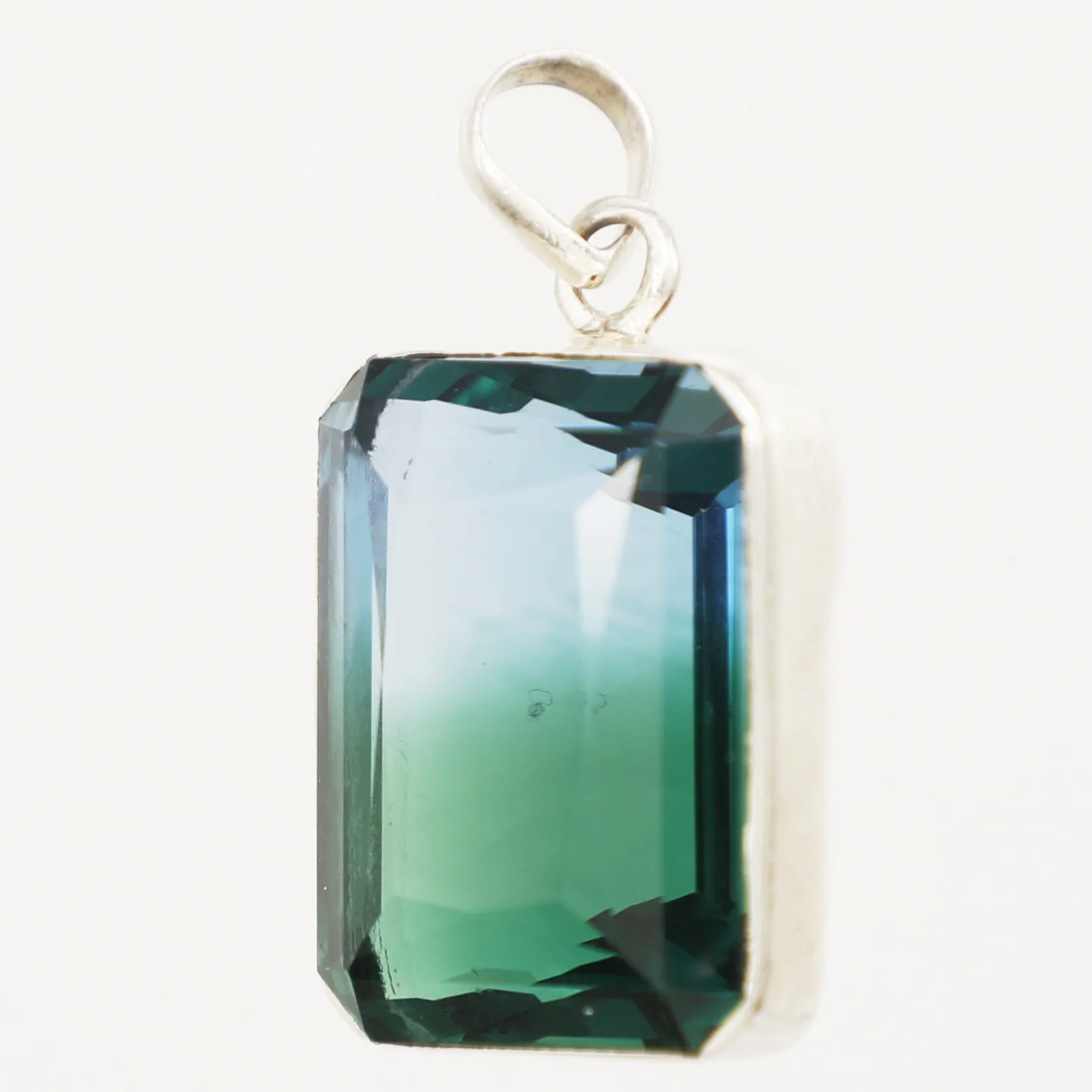 Hänge med fasettslipad blågrön glassten, längd 31mm inkl ögla, bredd 17mm, 925/1000 silver Vikt: 8,2 g.