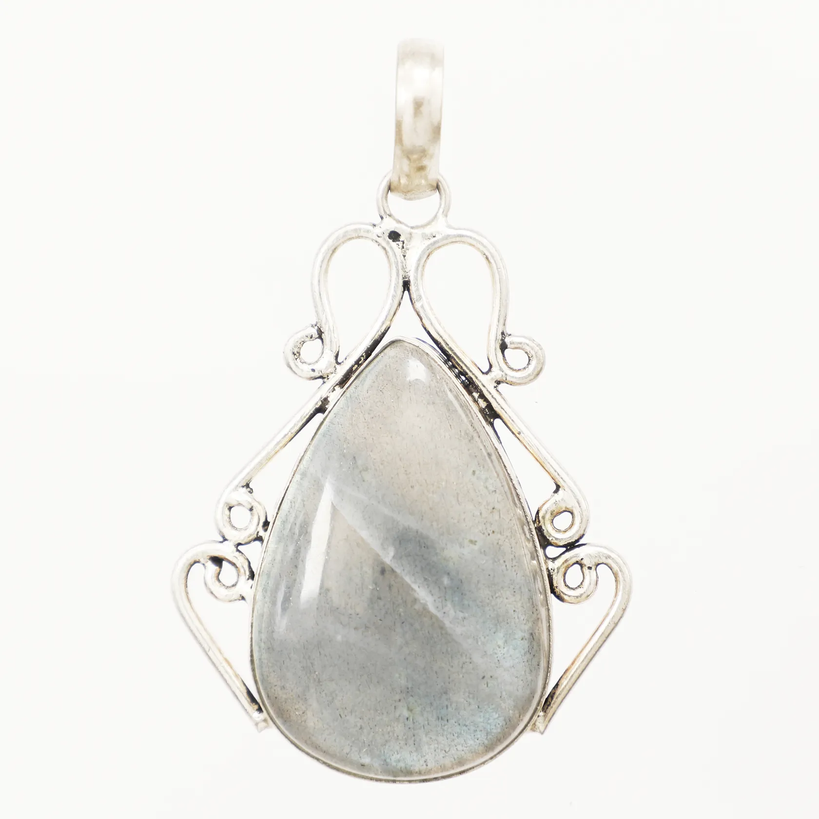 Hänge med labradorit, längd 60mm inkl ögla, bredd 38mm, 925/1000 silver Vikt: 13,4 g.