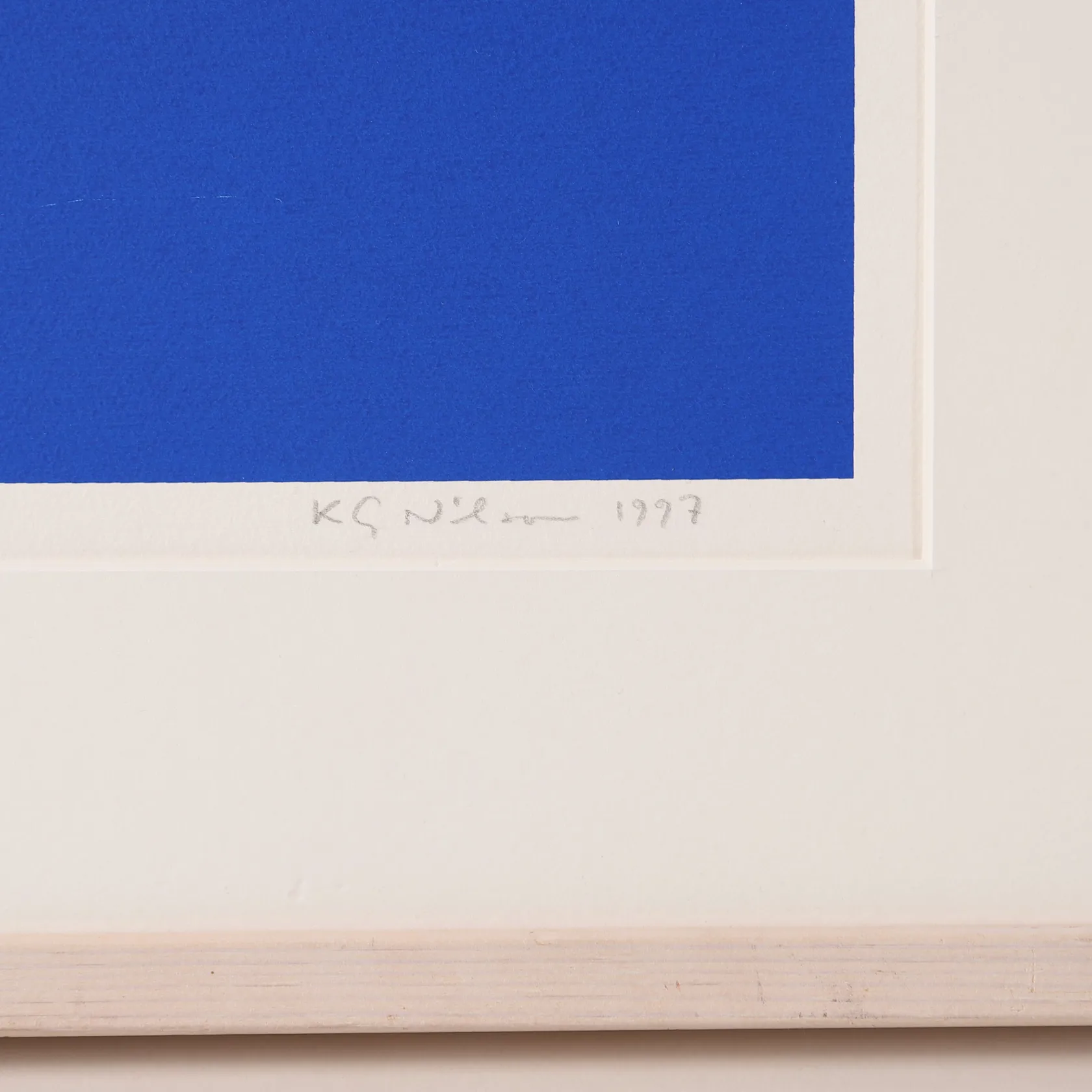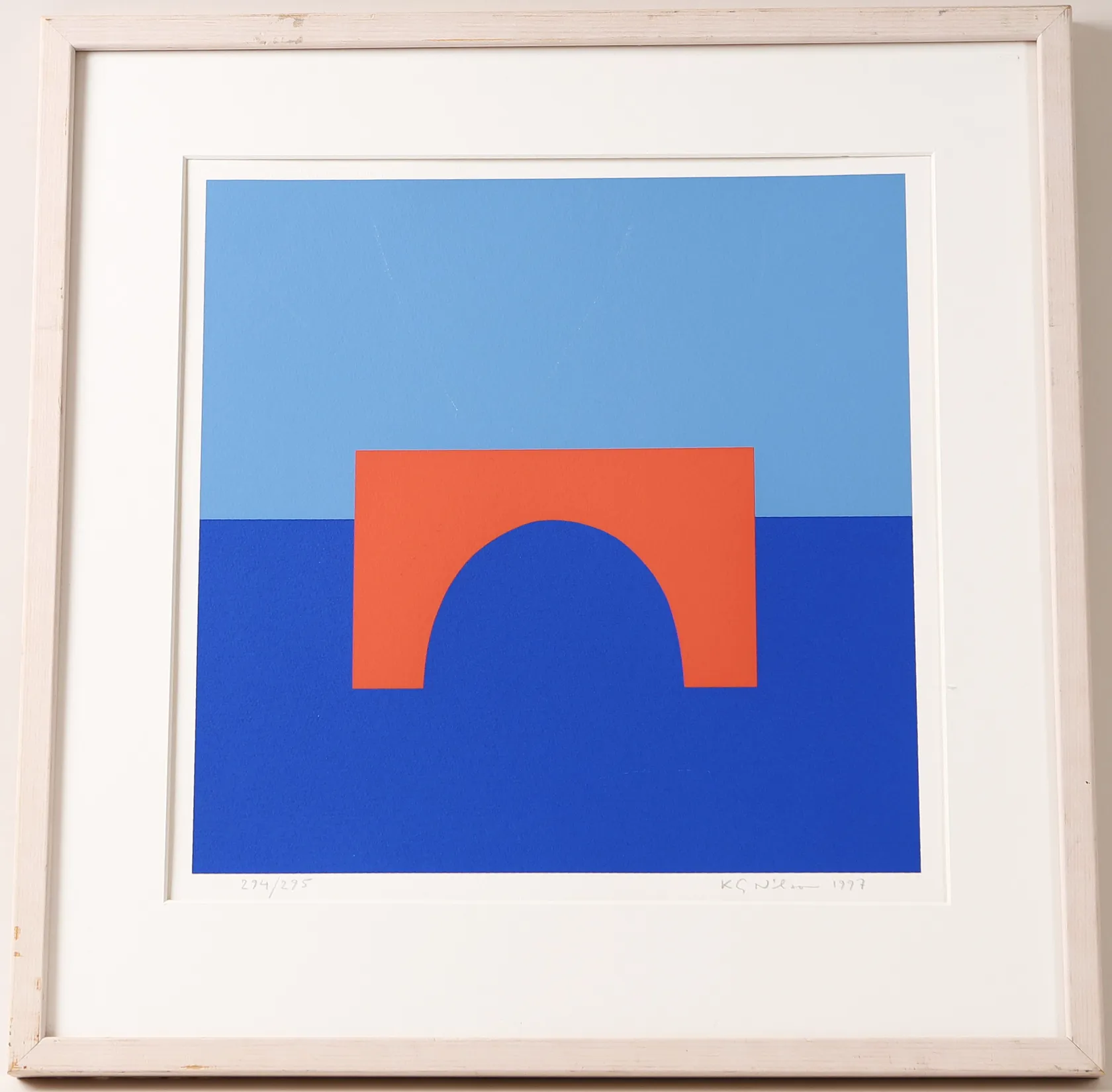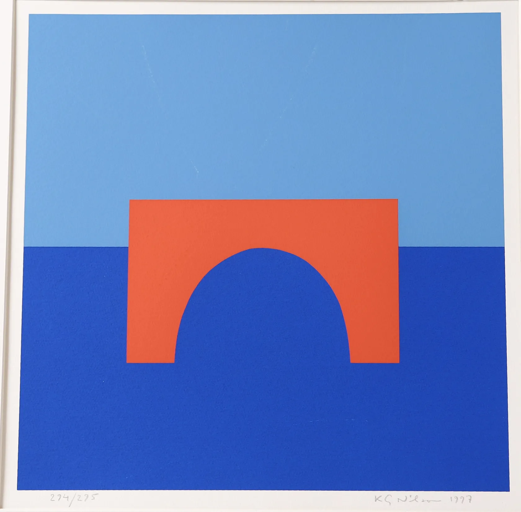 Tavla litografi, K.G. Nilson, "The Bridge", signerad och numrerad 294/295, daterad 1997, bildyta ca. 32 x 32cm, ej examinerad ur ram, saknar glas, repor på tryck, nagg på ram, nagg på passpartout. Skickas med postpaket.