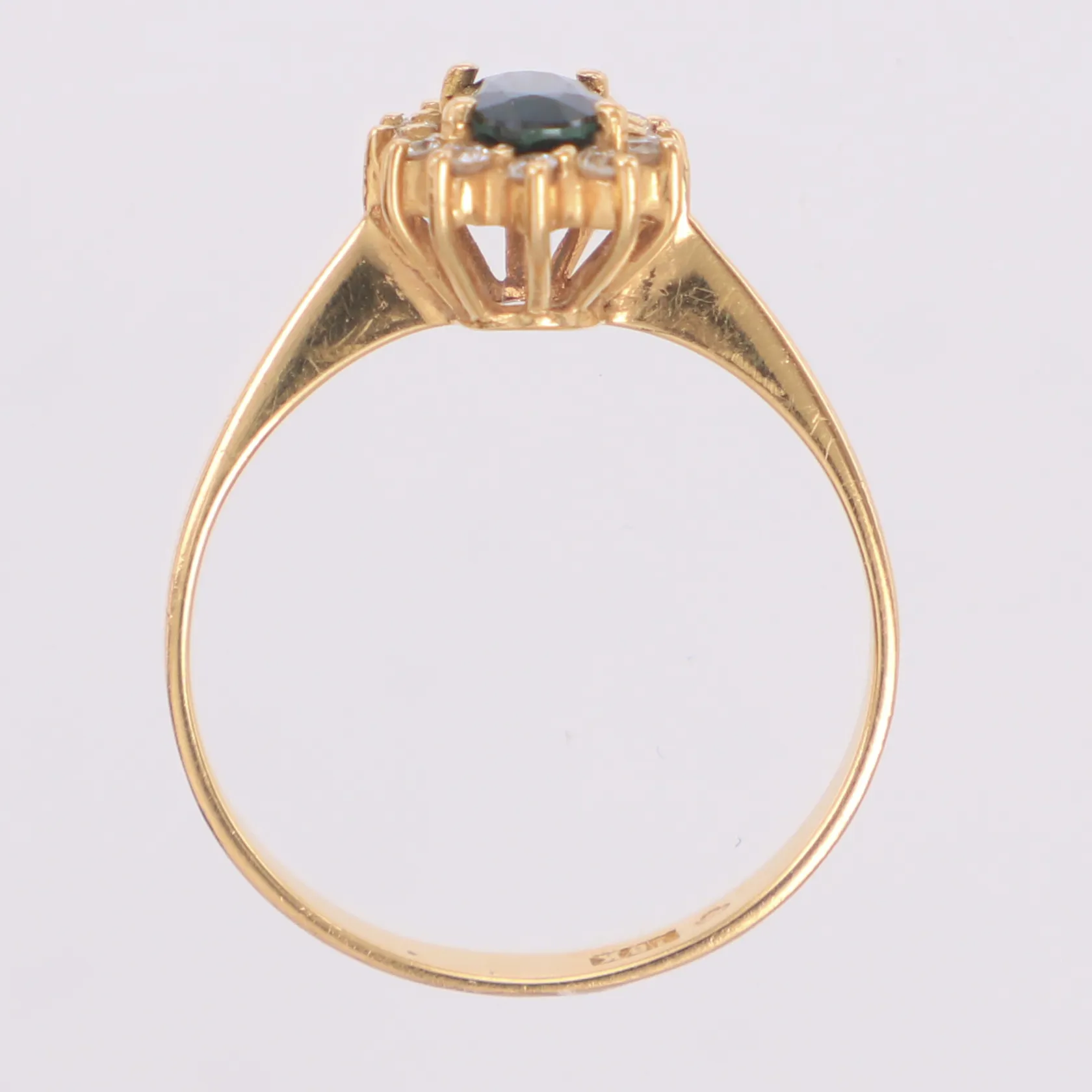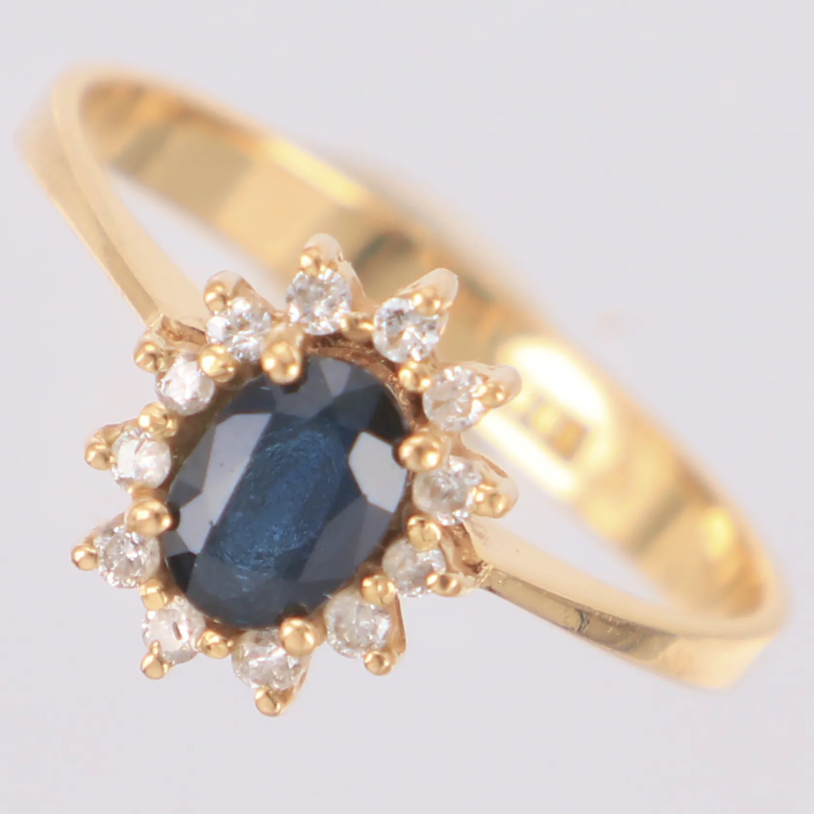 Carmoséring diamanter 12xca0,01ct och safir stl:17½, bredd 10mm, smärre nagg på safir, 18K Vikt: 2,4 g.