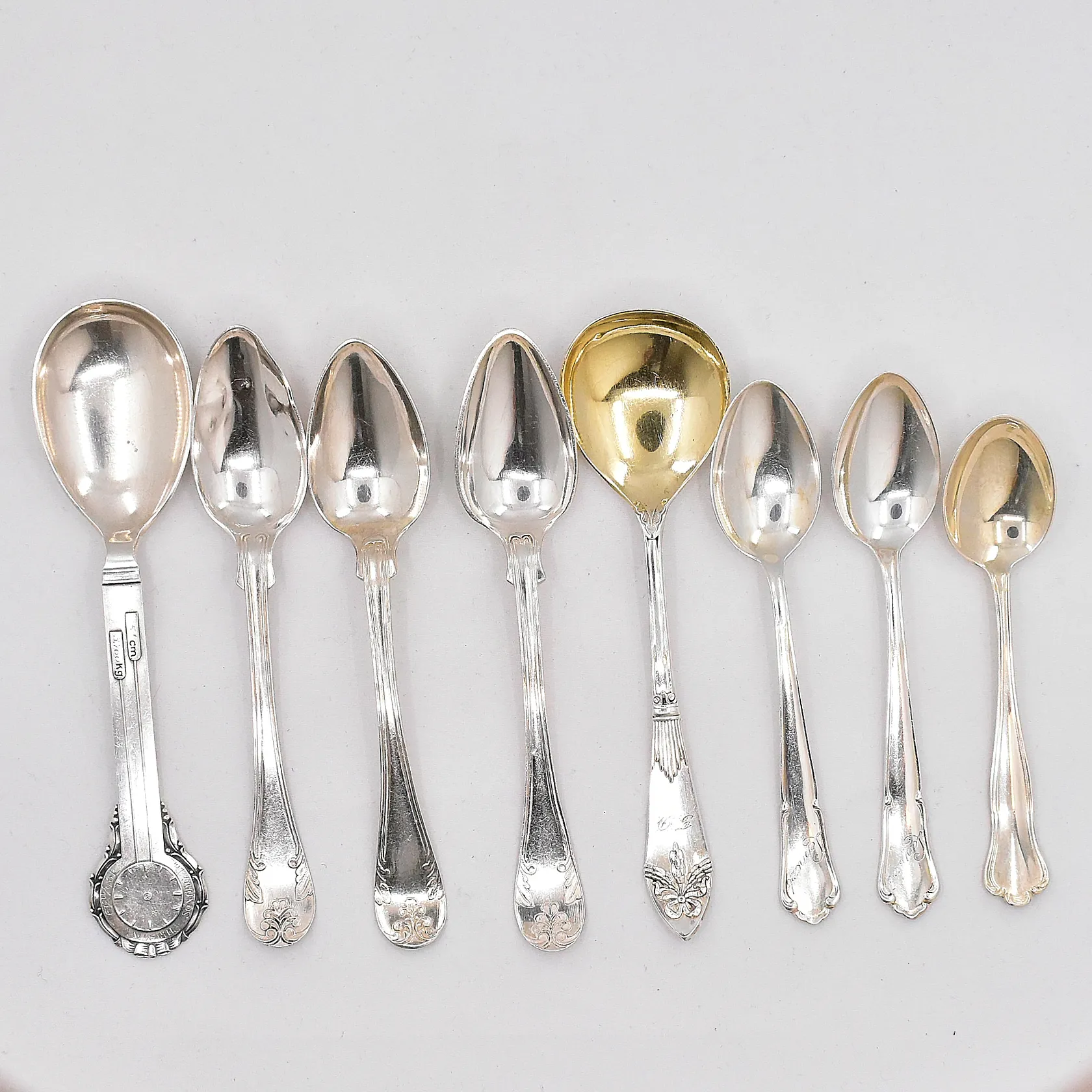 Åtta silverskedar, olika modeller, gravyrer, defekter, silver, 830/1000 Vikt: 140,4 g.