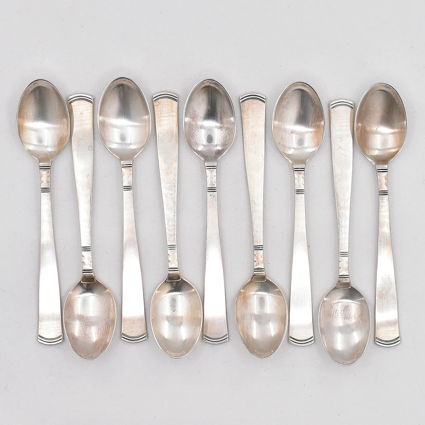 9 Kaffeskedar, modell Rosenholm, ca 12cm, GAB, silver 830/1000 Vikt: 130 g.