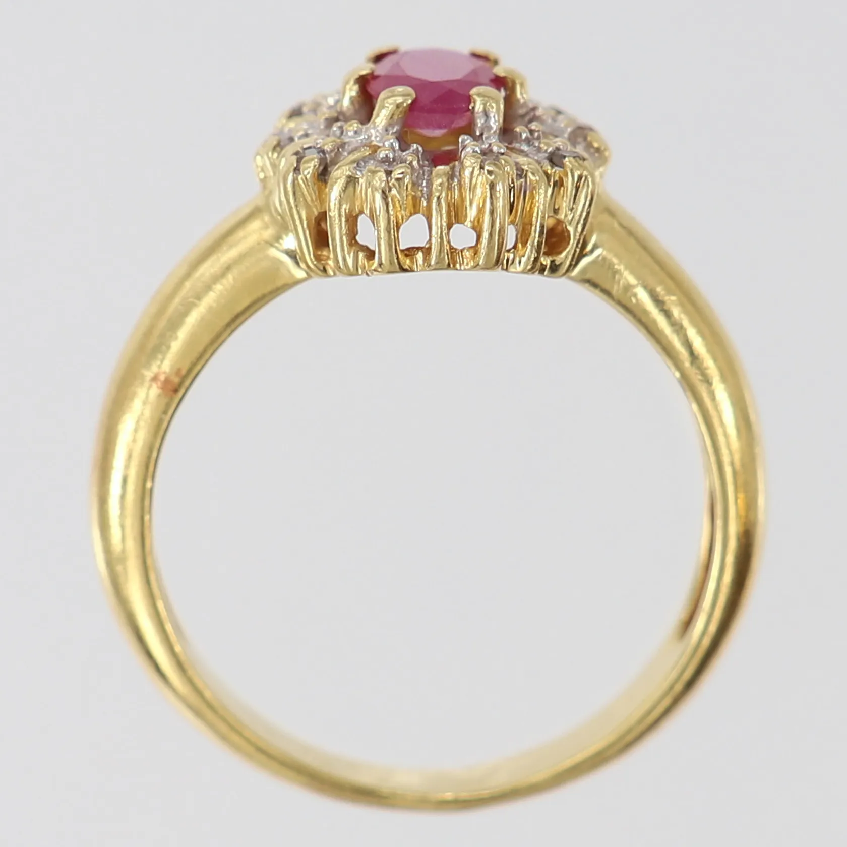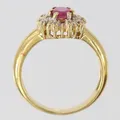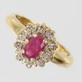 Ring med rubin med 8/8-slipade diamanter 10 x ca 0,0025ct, stl: 17, bredd 2,5-11mm, GHA, 18K. Vikt: 4,6 g.