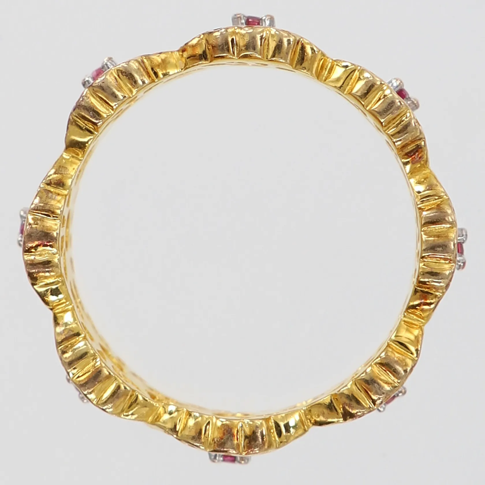 Ring med dekor samt rubiner 8 x ca 0,03ct, stl:18¼, bredd 7,8mm, tvåfärgat 14K. Vikt: 6,5 g.