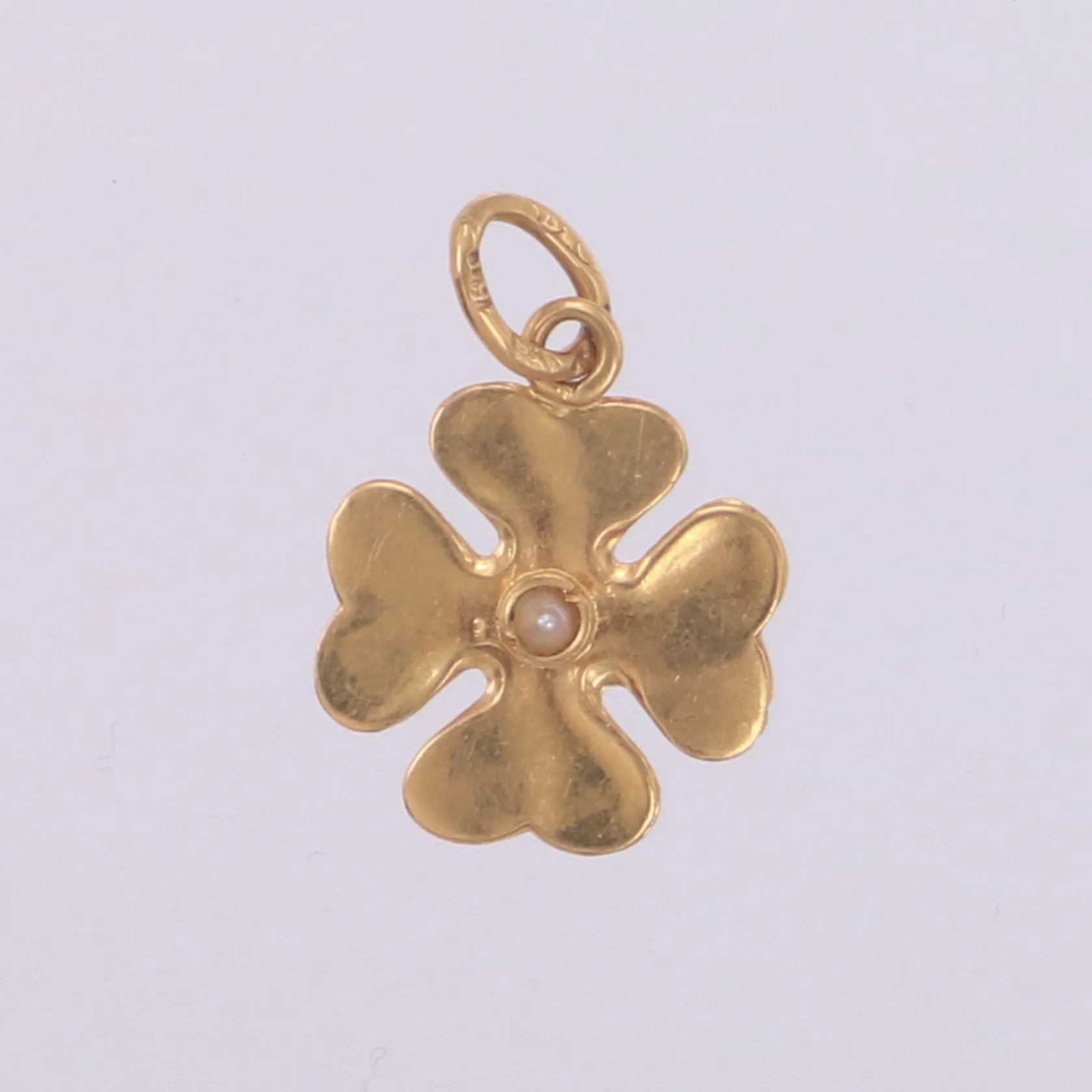 Hänge fyrklöver med pärla, längd 17mm inklusive ögla, bredd 11,5mm, 18K Vikt: 0,7 g.