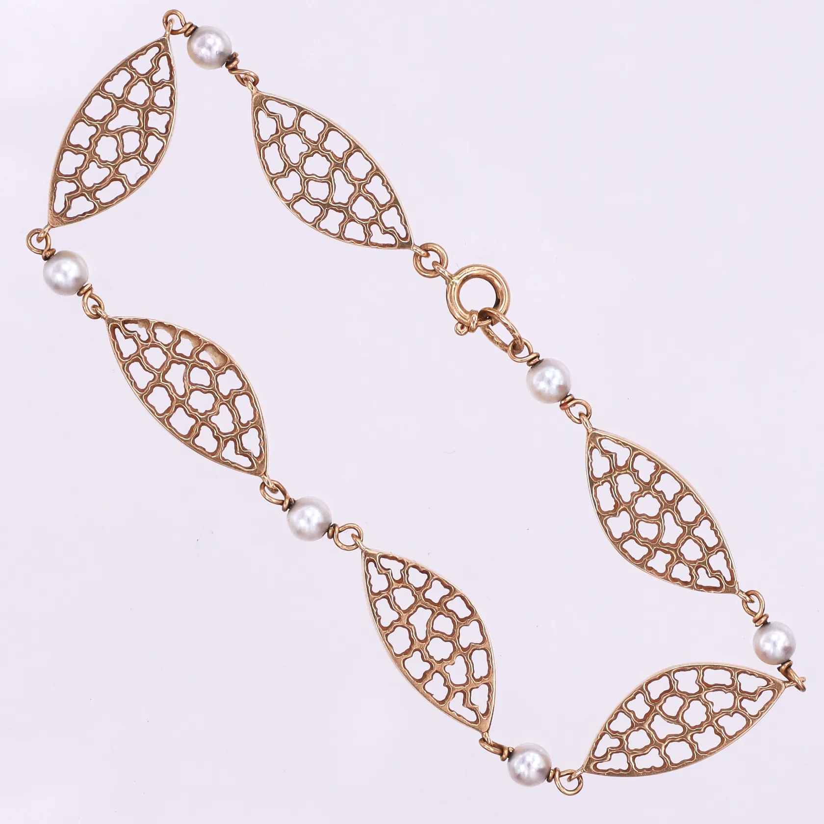 Armband med pärlor,Gustav Dahlgren & Co Malmö,längd ca 19.5 cm,bredd 3.9-8.9 mm,18k. Vikt: 7,8 g.
