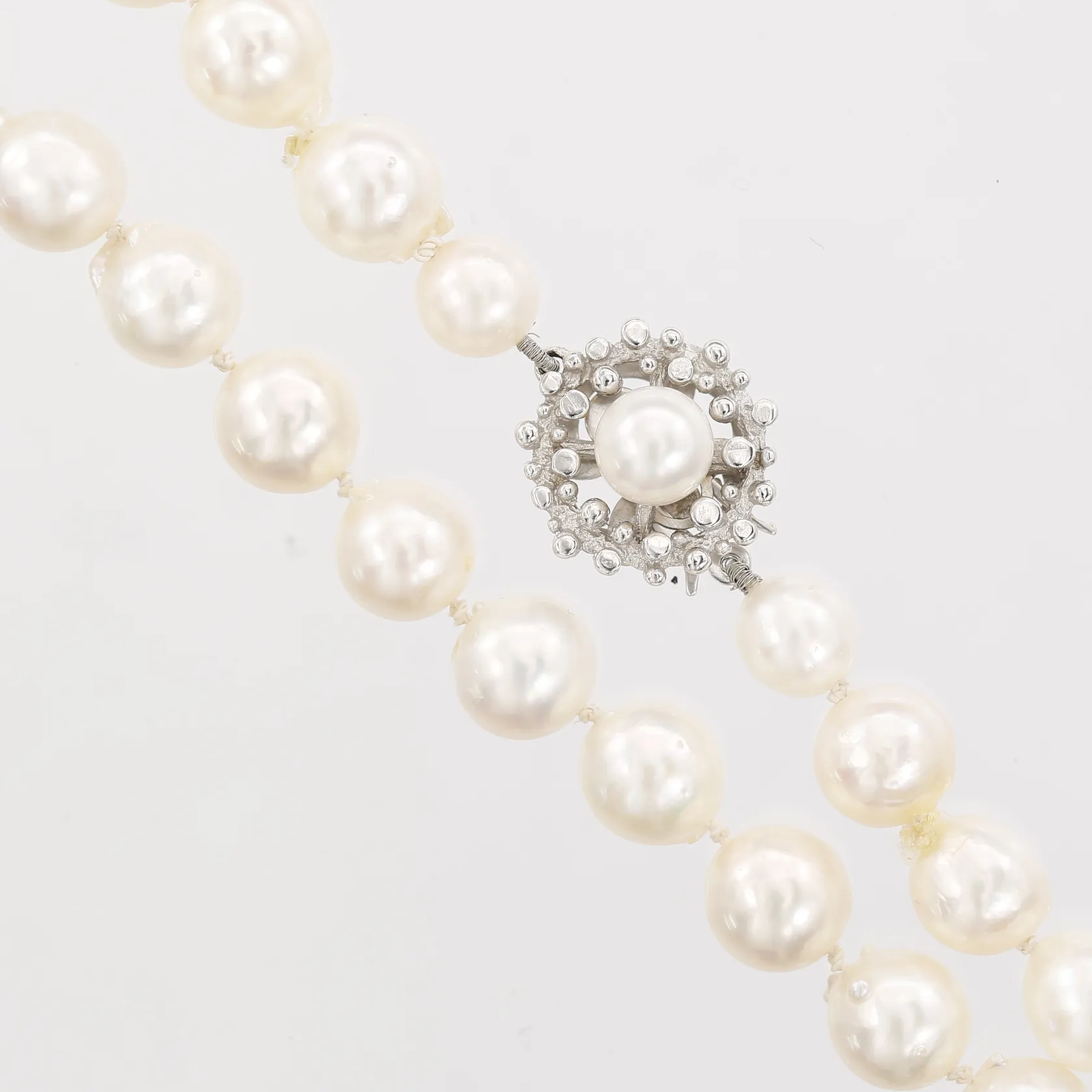 Pärlcollier med barocka odlade pärlor ca Ø8mm, lås i 18K med pärla, lås Ø16mm, 18K vitguld, bruttovikt: 58,2g. Vikt: 58,2 g.