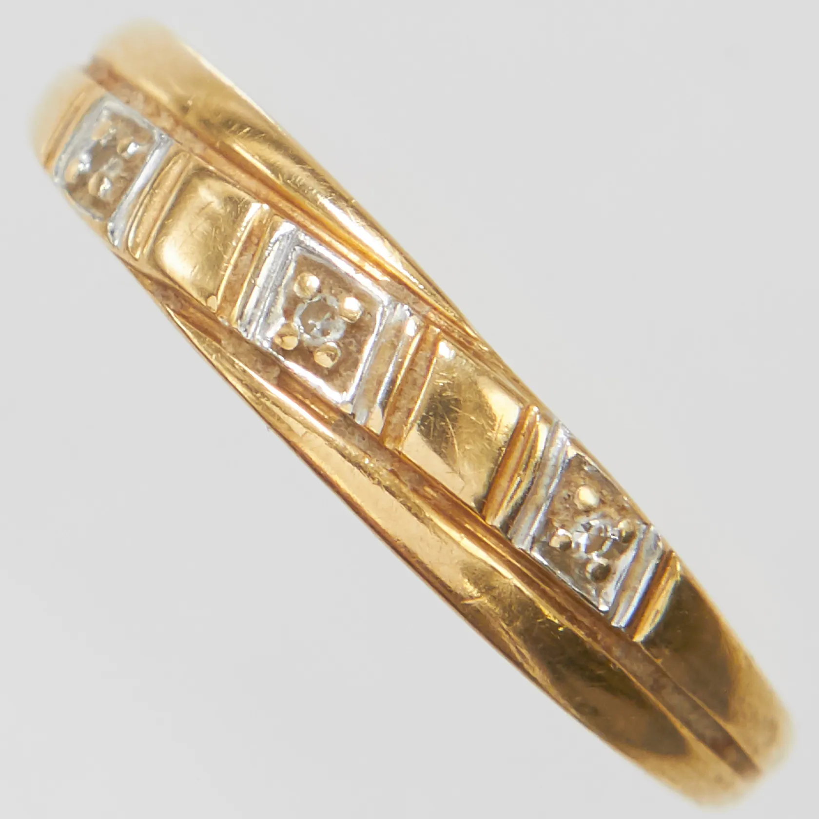 Ring med diamanter 3 x ca 0,005ct stl:18, bredd 1,5-4,5mm, GHA, 18K Vikt: 1,7 g.