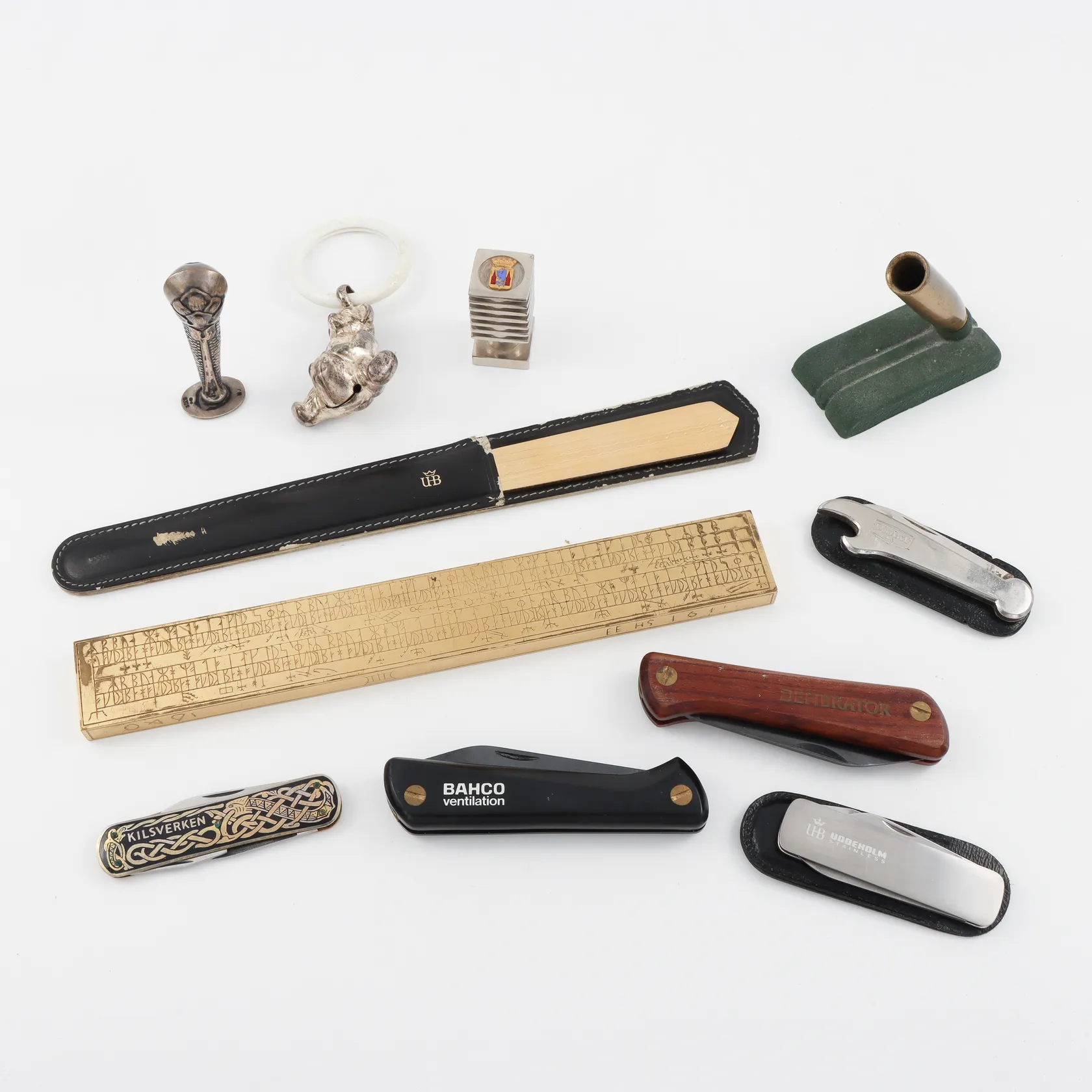 Runstav mässing, längd ca 24 cm, fällknivar bla Kilsverken, sigill 2 st varav 1 st silver, pennställ, skallra. Skickas med postpaket.