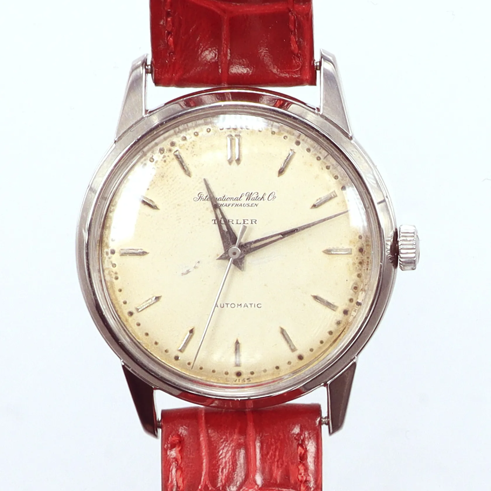 Herrur vintage IWC, International Watch Co Schaffhausen, Türler, 35,5mm, stål, automatisk, nytt rött läderband ej original, skadad urtavla, fungerar.