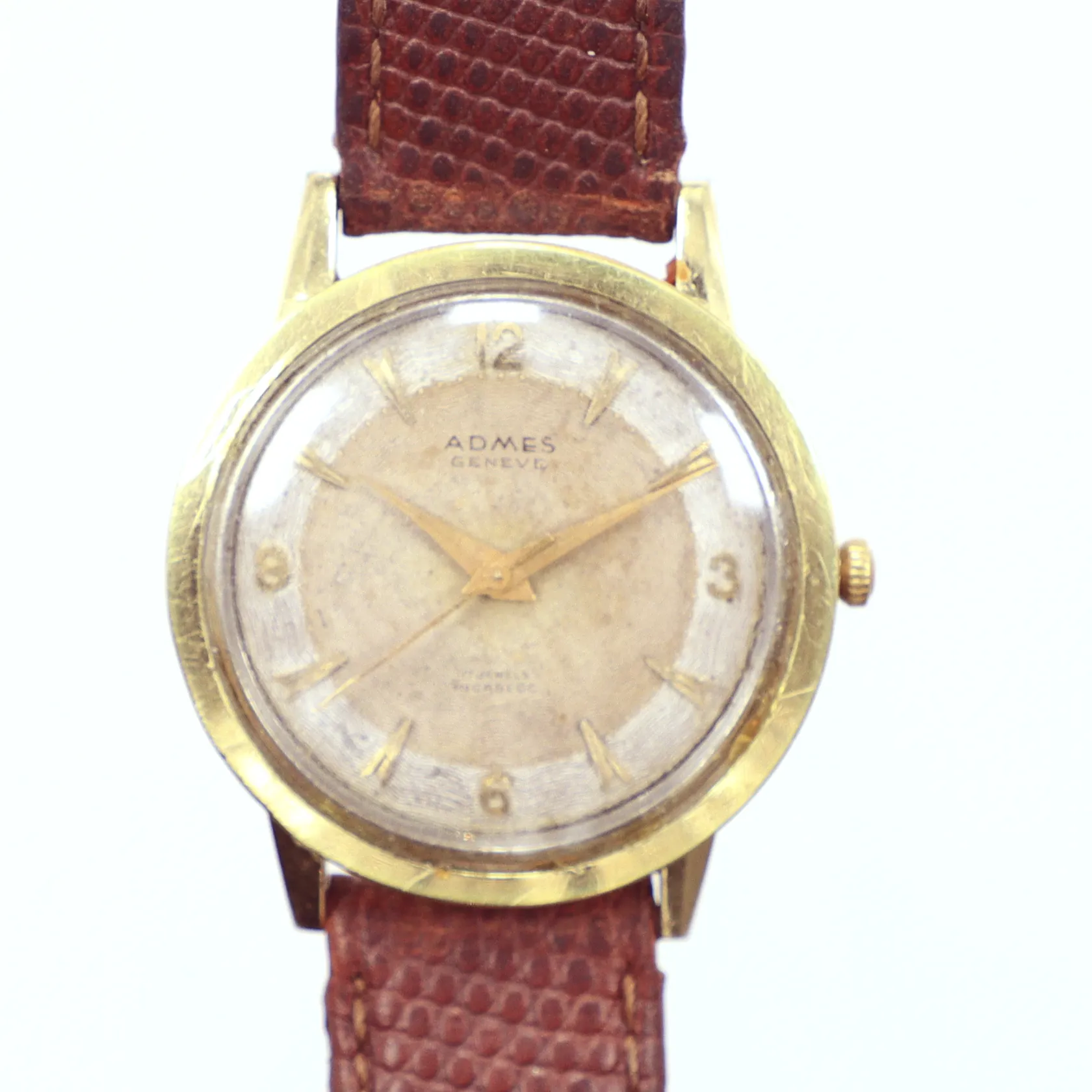 Herrur Admes, mekanisk, vintage, personlig gravyr, Ø35,5mm, slitet skinnband, 17 stenar, repig bakboett
