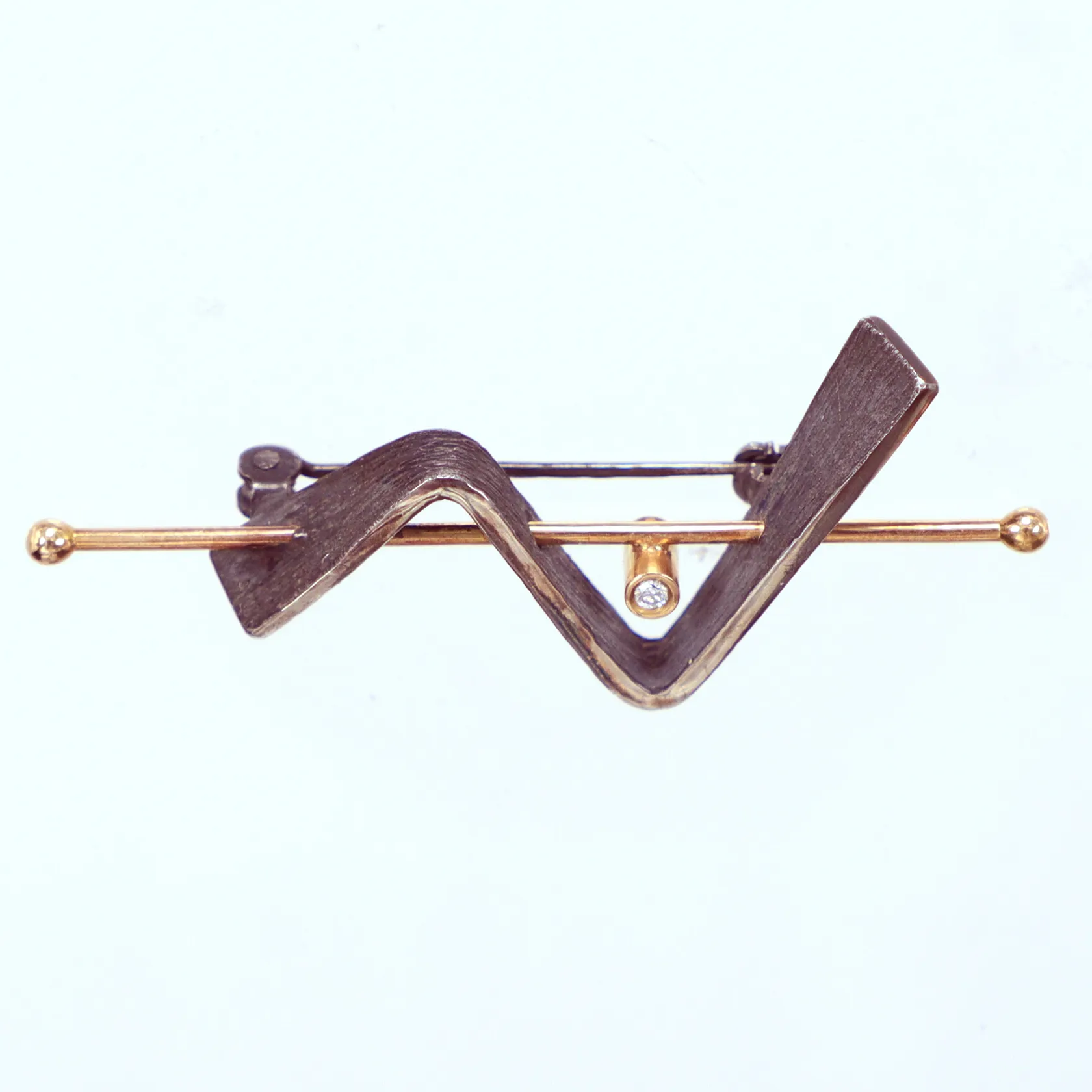 Brosch, stål med guldstav, diamant 1x0,02ct, längd 5,5cm, bredd 17,4mm,18K Vikt: 7,2 g.