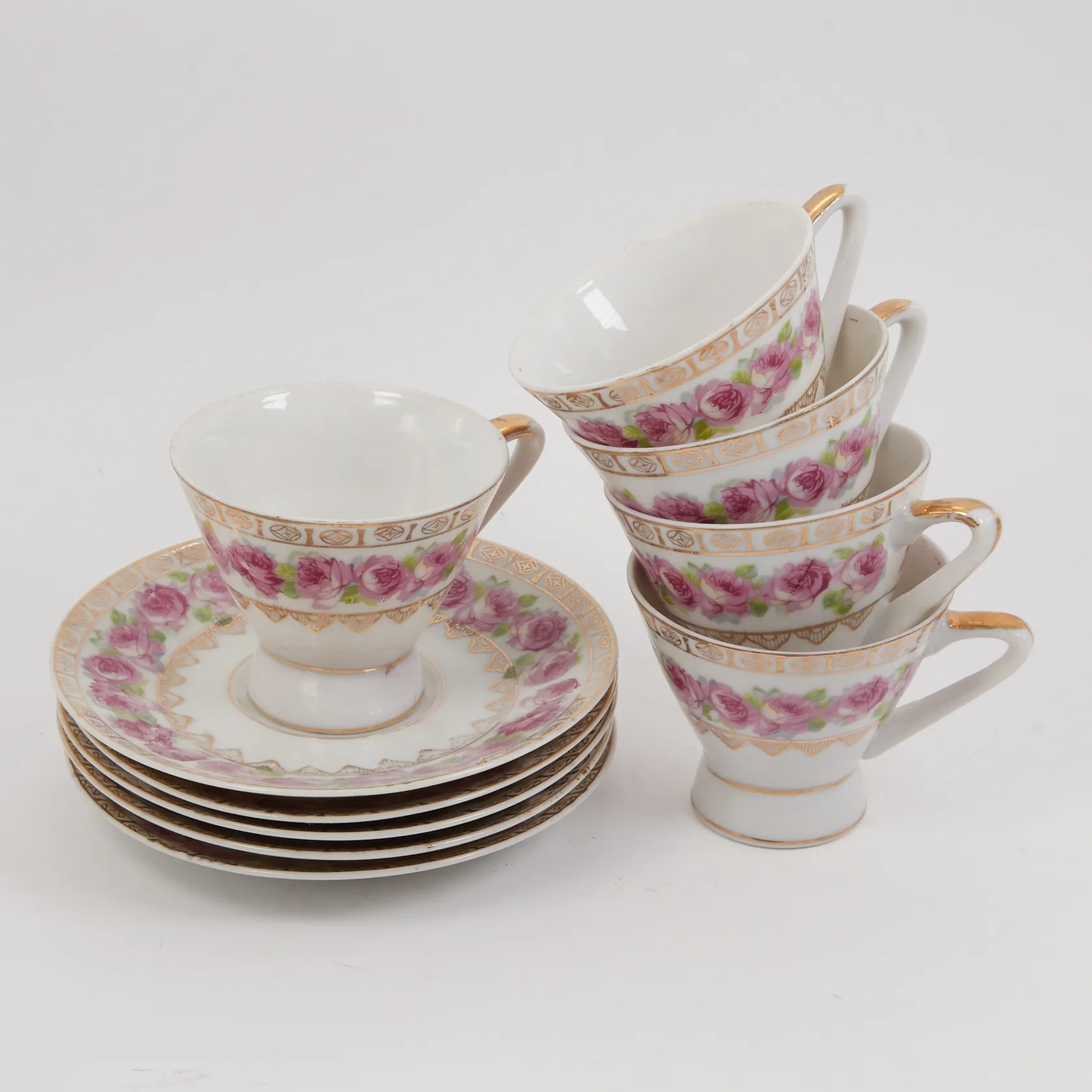5 Mockakoppar med 5 fat, Terra, höjd 5,5cm, Ø ca 11,5cm, porslin blomdekor med guldfärgade detaljer, slitage/märken/tillverkningsdefekter Skickas med paket..