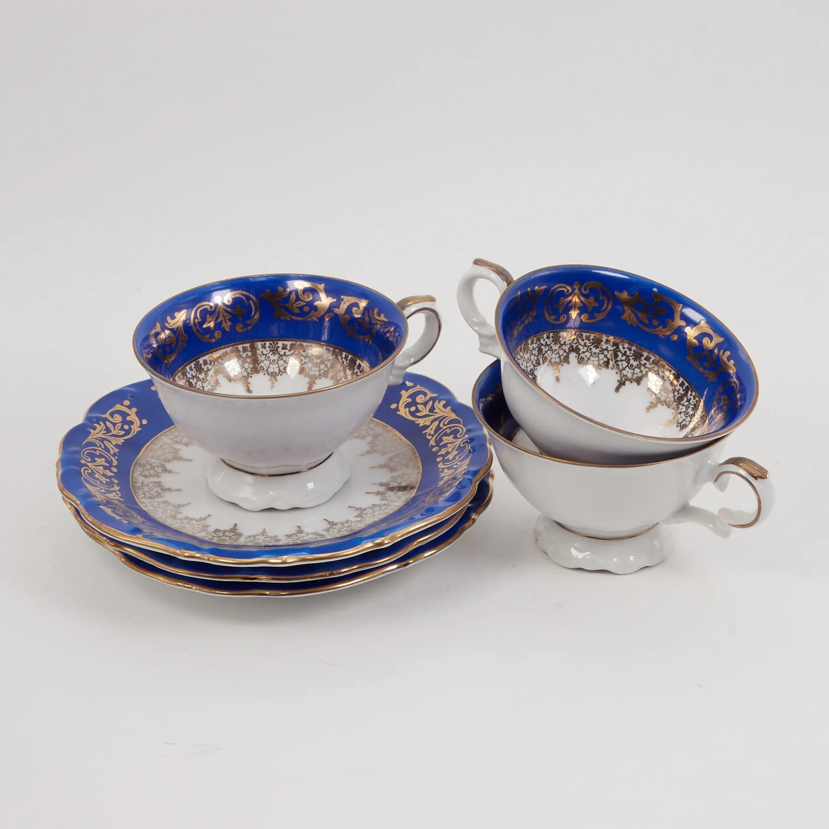 3 Mockakoppar med 3 fat, Bareuther Waldsassen Bavaria, höjd 4,9cm, Ø 11,5cm, porslin målat i mörkblå färg och guldfärgad dekor, slitage Skickas med paket..