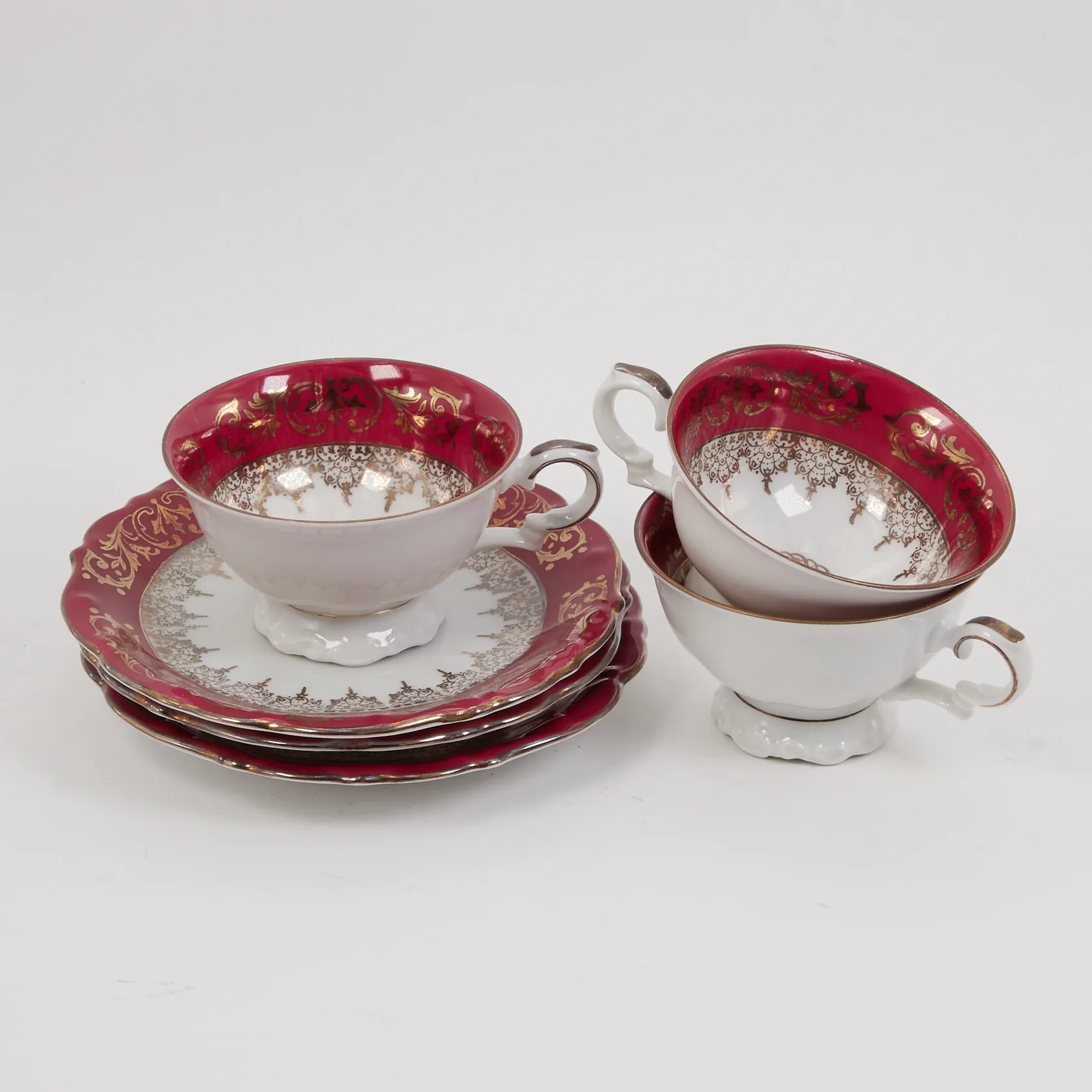 3 Mockakoppar med 3 fat, Bareuther Waldsassen Bavaria, höjd 4,9cm, Ø 11,5cm, porslin målat i mörkröd färg och guldfärgad dekor, slitage Skickas med paket..
