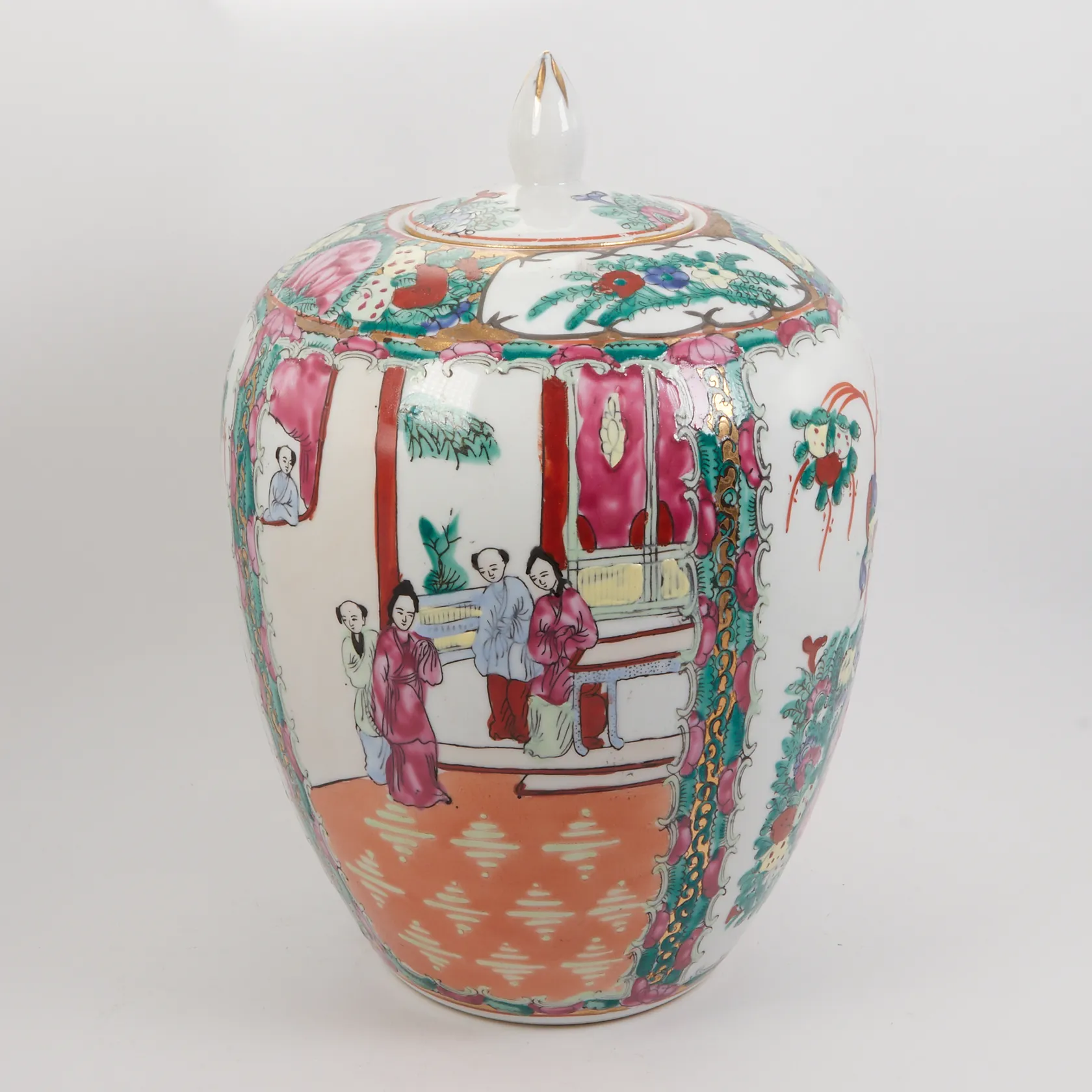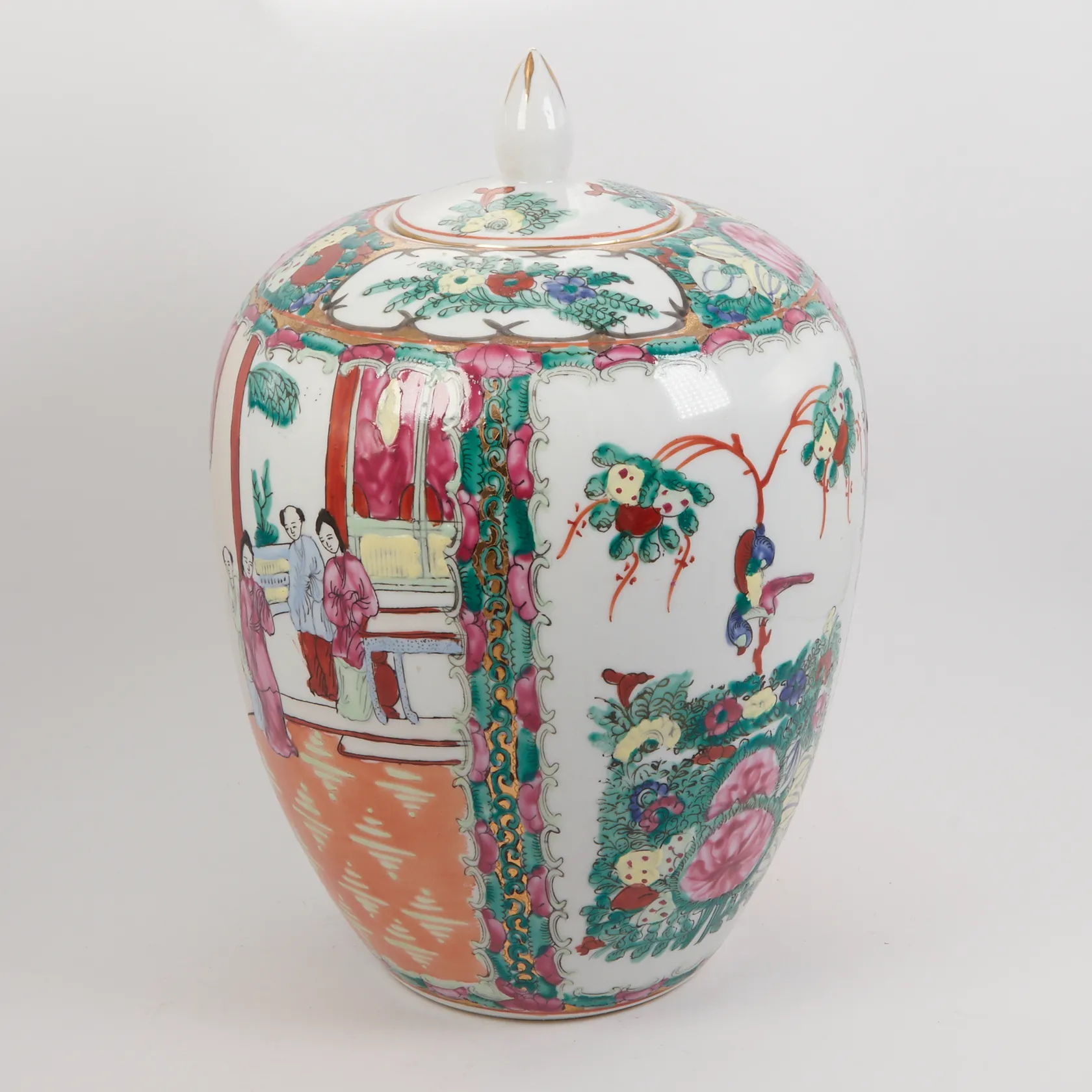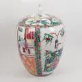 Lockurna, bemålad med Asiatisk motiv, ojämn botten, slitage och färgbortfall, höjd inkl lock ca 30cm, Ø ca 55cm. Skickas med postpaket.