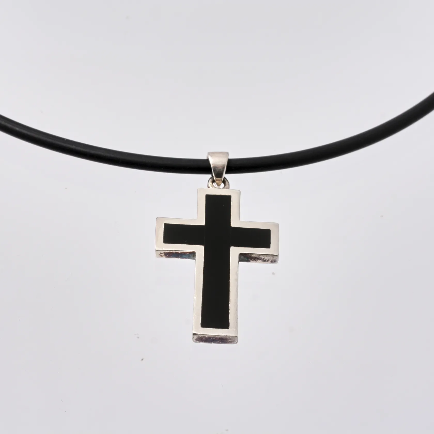 Hänge i silver med svart sten, mått 23x42mm, svart gummi i remmen, 925/1000, tillverkad av Guldfynd, total vikt 13,89g. Vikt: 13,9 g.