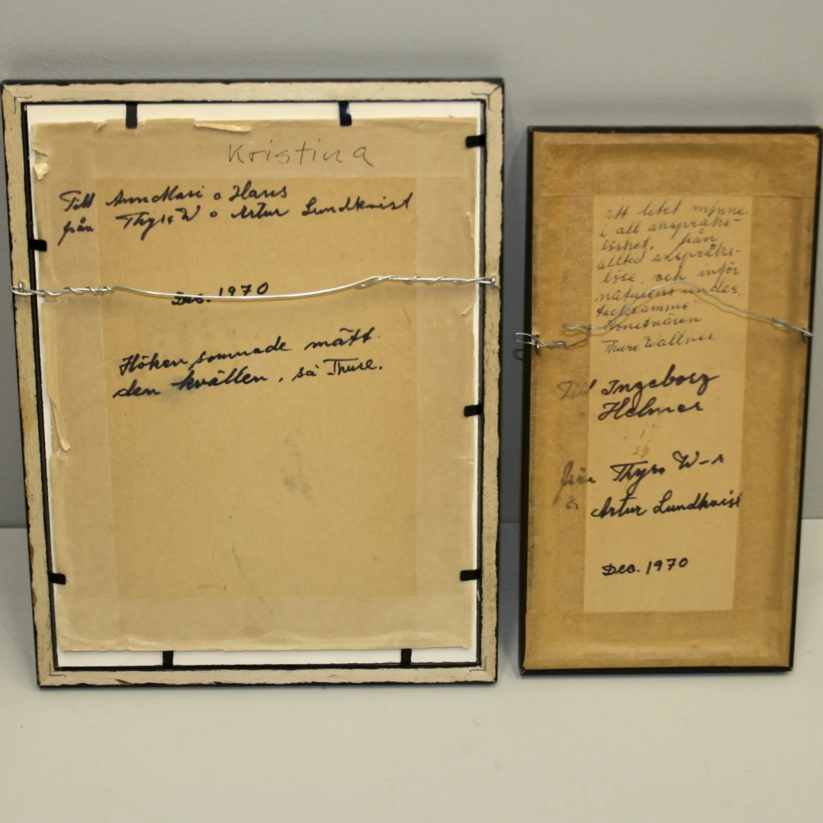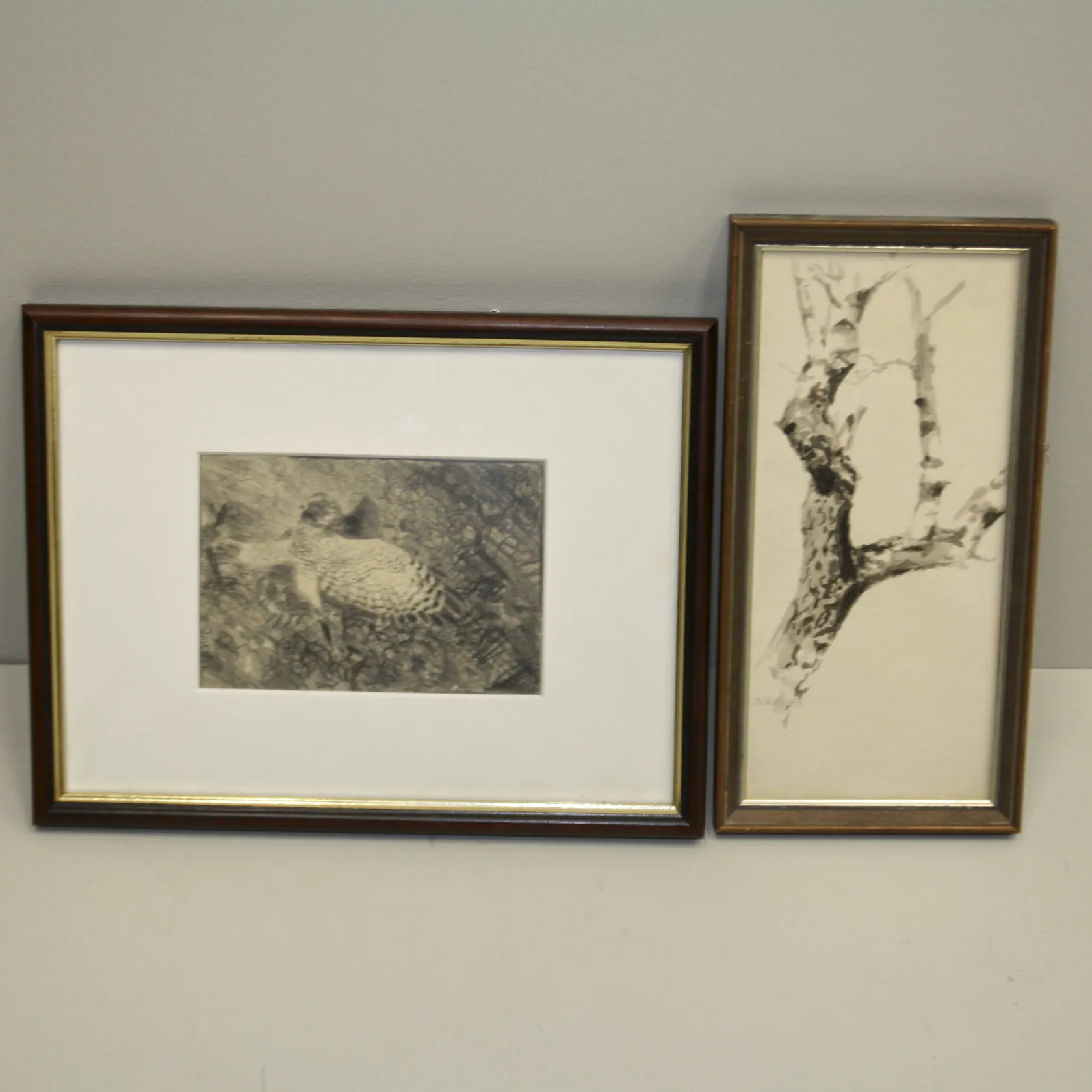 2st tavlor i blyerts, Thure Wallner, bildmått ca 13x9cm, rammått 26x20cm, (Höken somnade mätt år 1970) Tavla med träd har bildmått 9,5x21cm, rammått 12x24cm år 1970, Omfattas av BUS-avgift.
