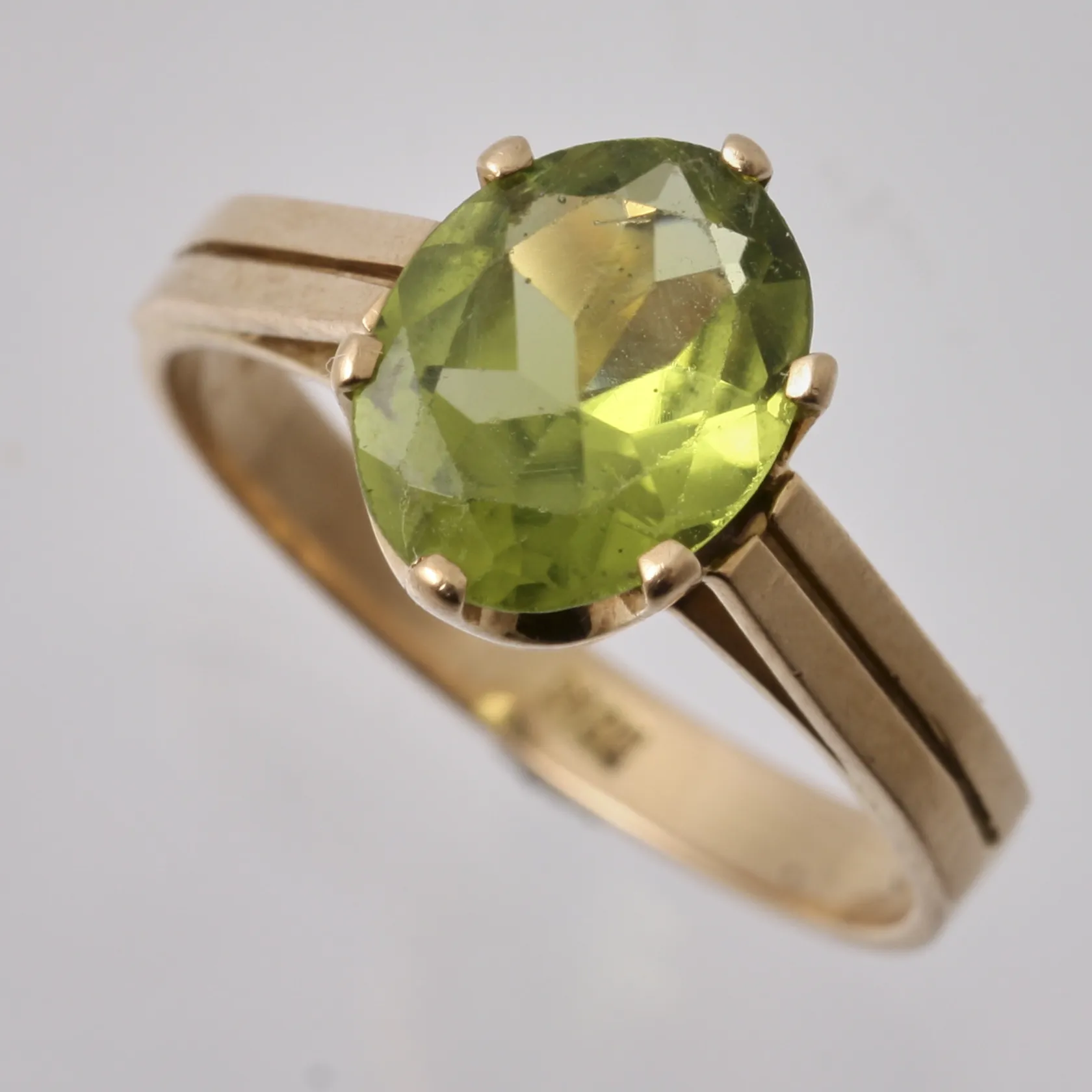 Ring i 18K guld, stl 16½, bredd 2,6-9,7mm, 1 grön sten, mått Ø7-8,5mm, importstämplad, vikt 3,1g. Vikt: 3,1 g.