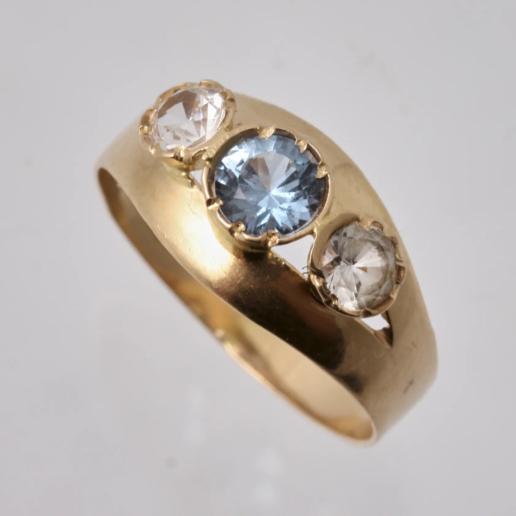 Ring i 18K guld, stl 17, bredd 3,7-8,6mm, 1 blå sten, mått Ø4mm, 2st vita stenar, mått Ø3,6mm, tillverkad av Dahlströms Guldsmedsaffär Eftr, år 1962, vikt 1,9g. Vikt: 1,9 g.