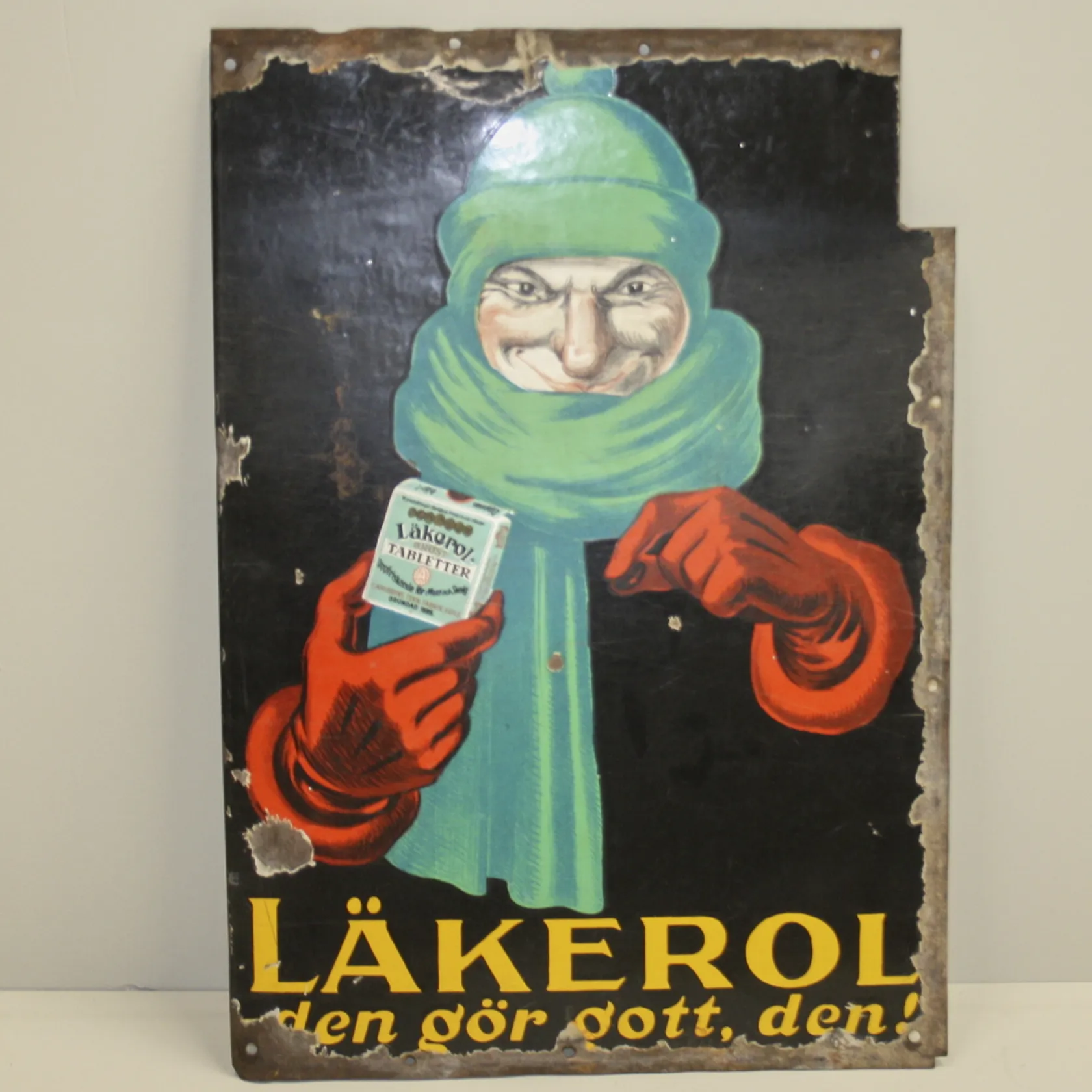Emaljskylt "Läkerol - den gör gott, den!", mått ca 70x49cm, emaljbortfall, repig. Skickas med postpaket.