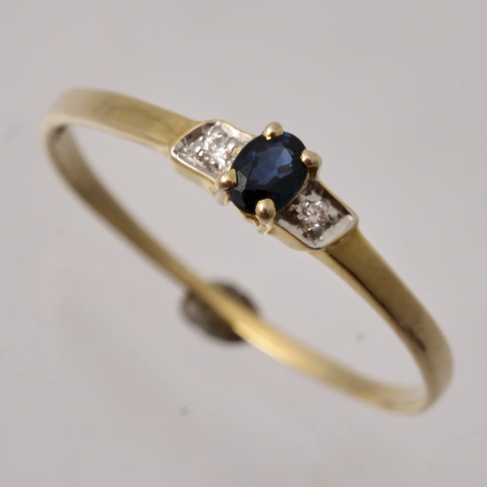 Ring i 18K guld, stl 17½, bredd 1,1-3,5mm, 1st blå sten, mått 2,6x3,6mm, 2st vita stenar, mått Ø1,3mm, vikt 0,88g. Vikt: 0,9 g.