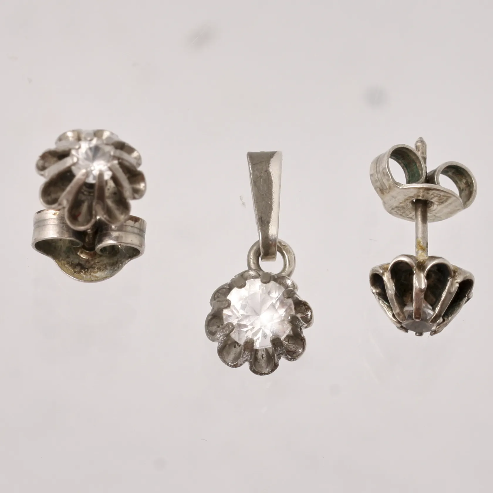 Set i silver, 1par örhängen, mått Ø7mm, vita stenar, mått Ø3mm, hänge, mått 7x15,5mm, 1st vit sten, mått Ø 4,6mm, 830/1000, vikt 1,74g. Vikt: 1,7 g.