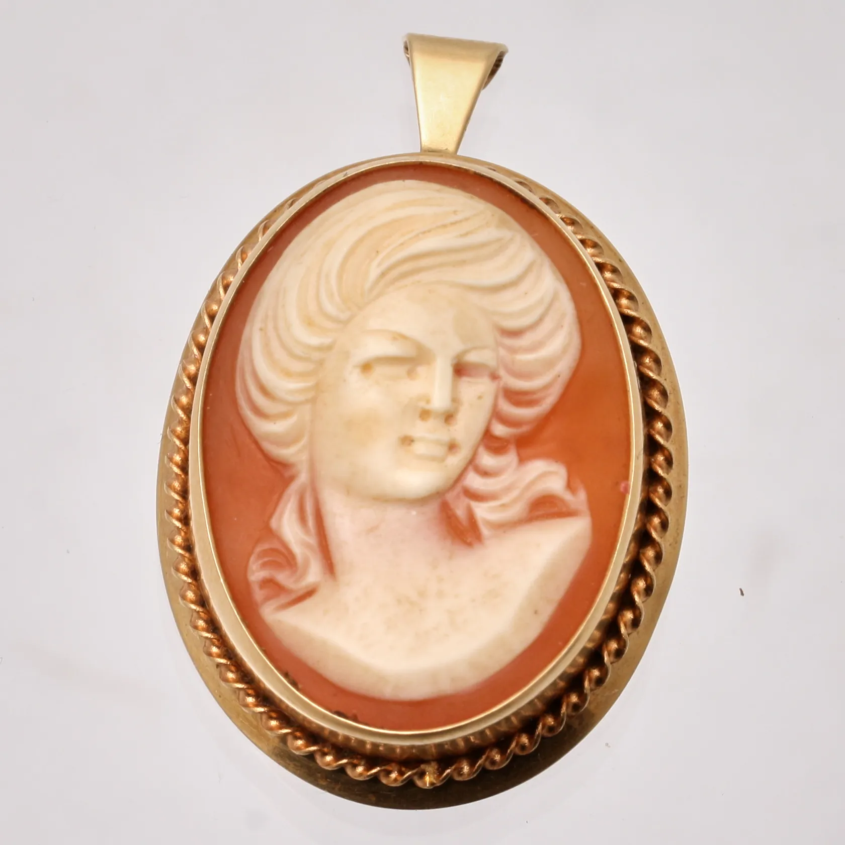 Hänge/Brosch i 18K guld, mått 22,8x32,4mm, Camé, mått 18,3x24m, bruttovikt 6,15g, ca nettovikt 4,15g. Vikt: 4,2 g.
