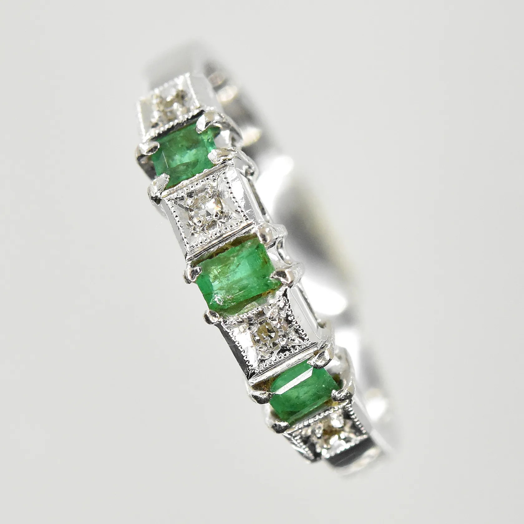 Ring med gröna och vita stenar, stl 16, bredd 2-4 mm, vitguld, 18K. Vikt: 2,5 g.