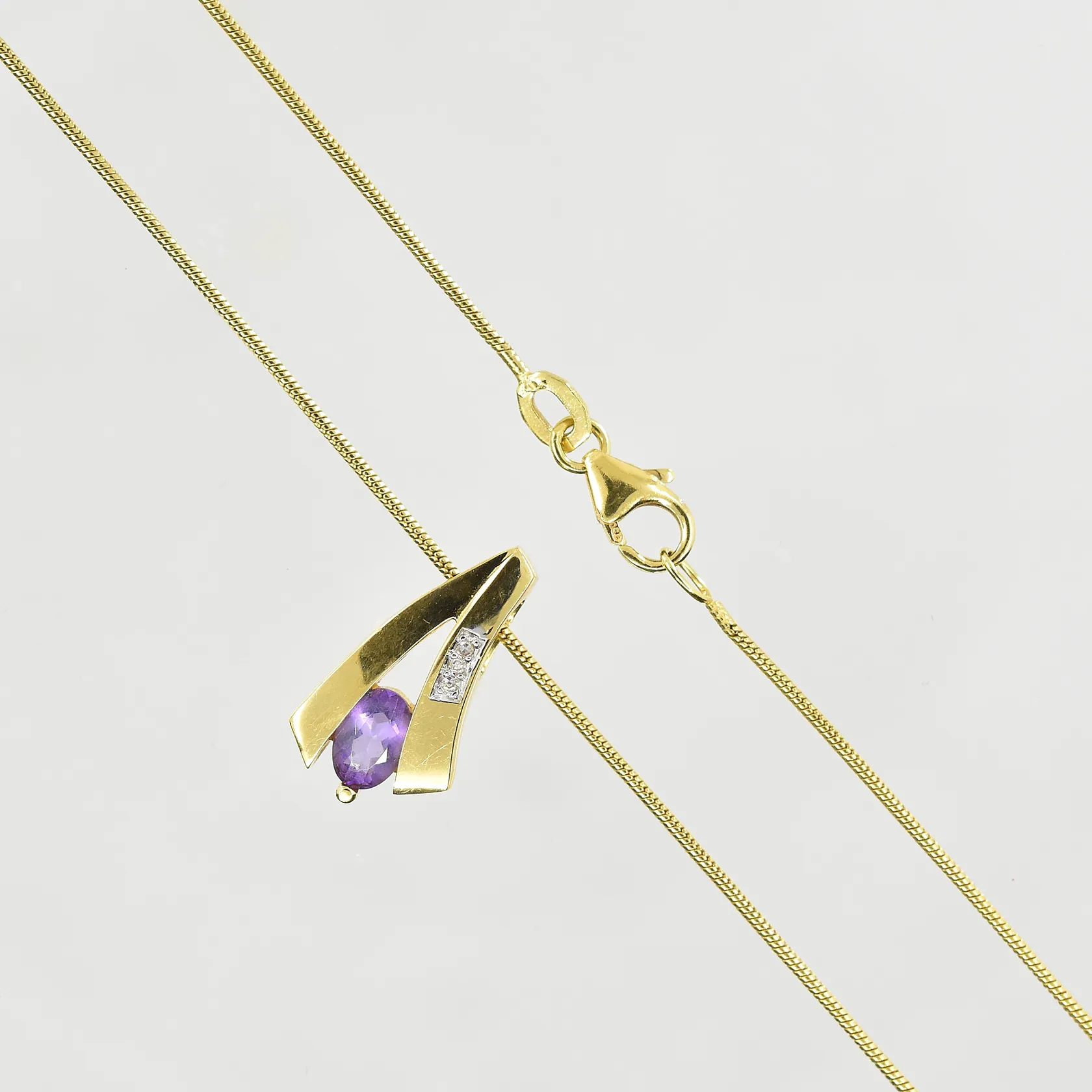Kedja Ormlänk med hänge med Ametist och vita stenar, längd 38½ cm, länkens bredd 1 mm, hänge längd 17 mm, 18K. Vikt: 5,3 g.