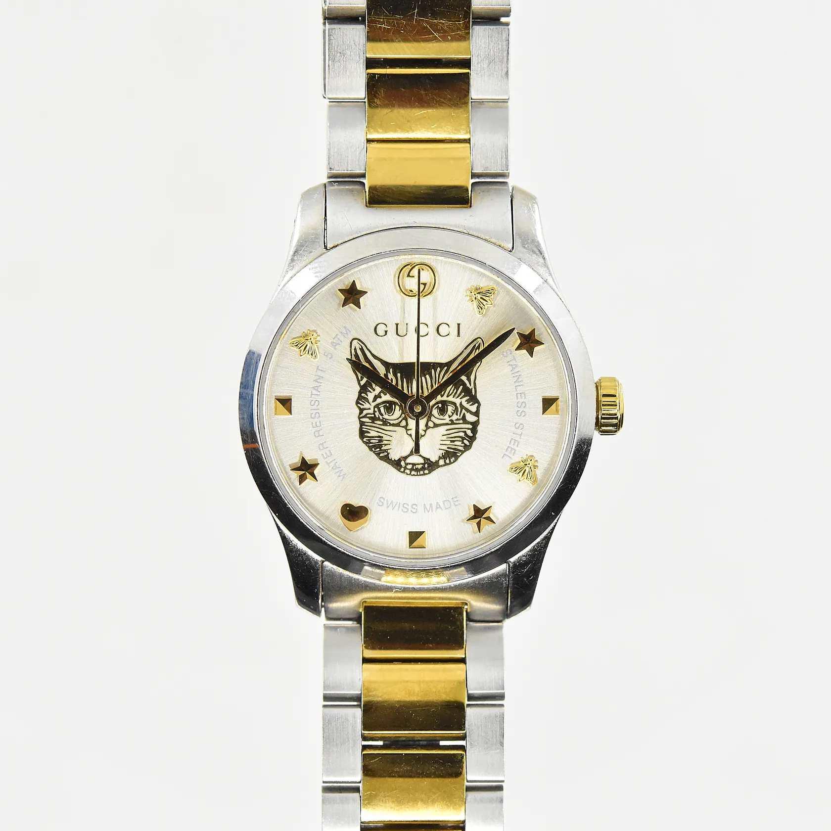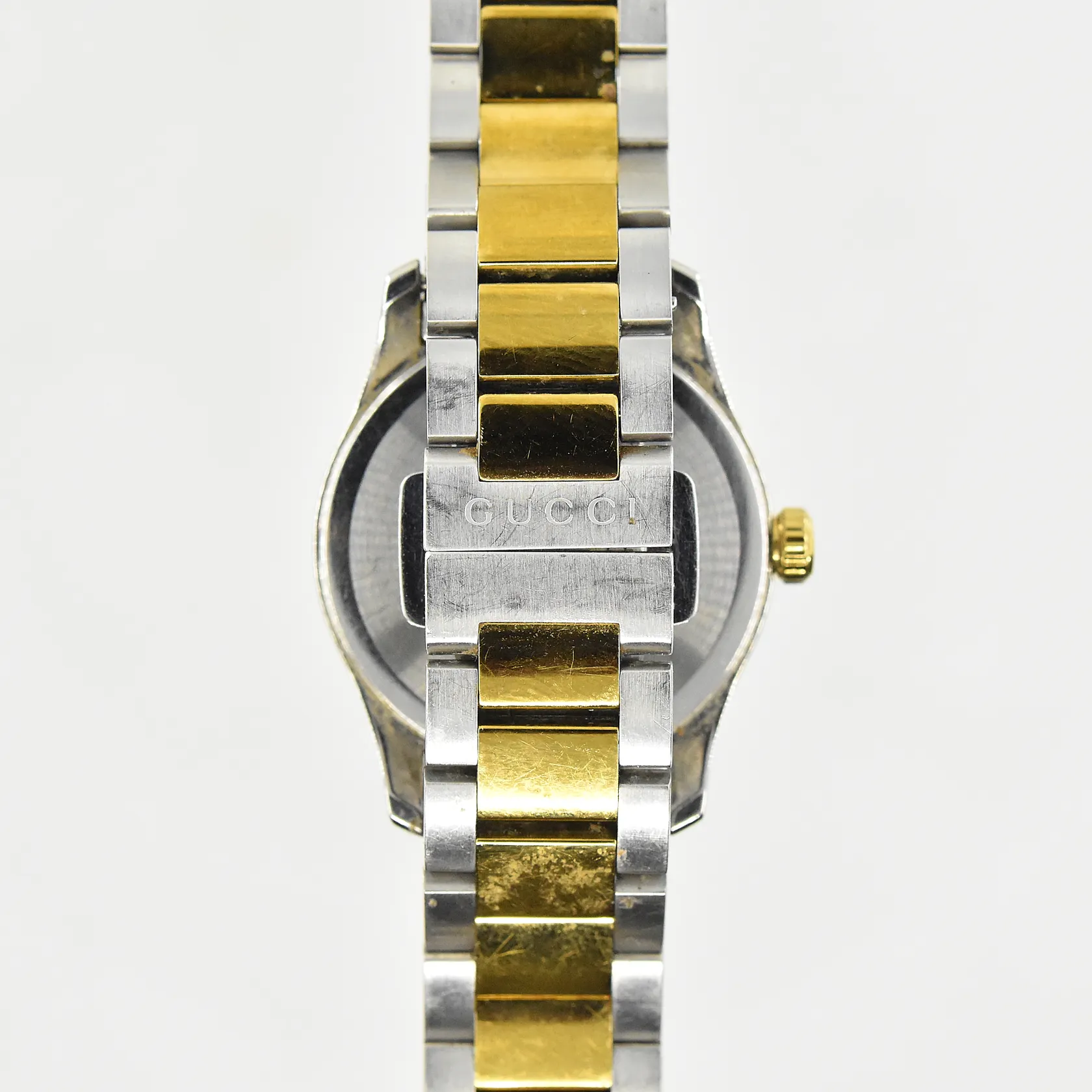 Damur Gucci G-timeless, boett Ø26 mm, quartz, stål/doublé, repig, safirglas, refnr YA126596, boettnr 18000618, bruksslitage, fungerade vid testtillfället, inga tillbehör.