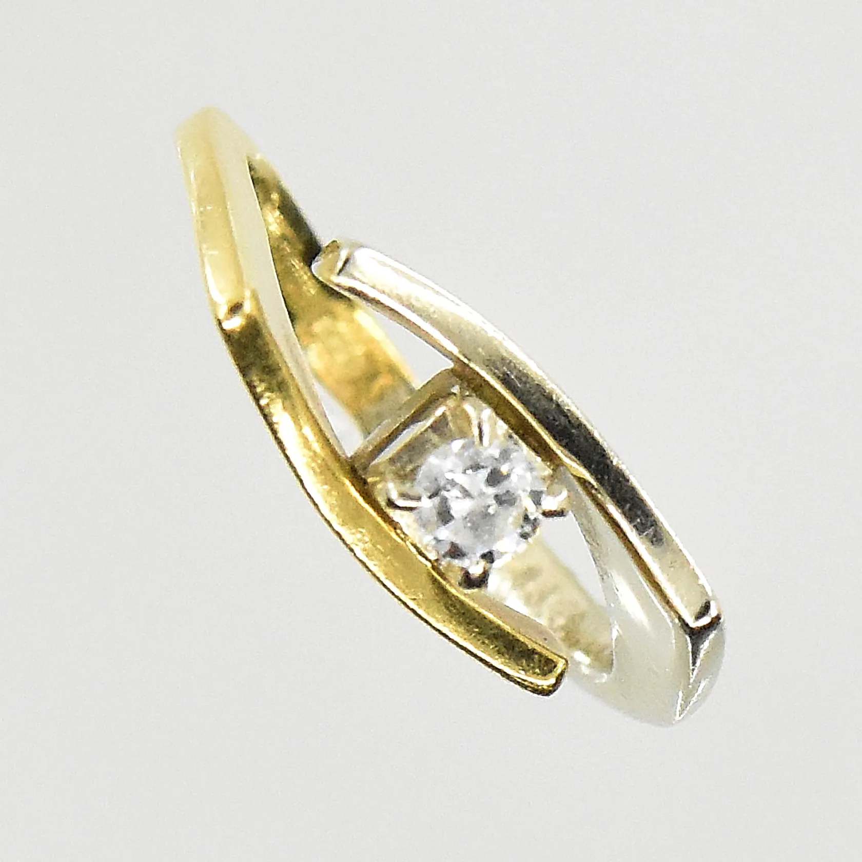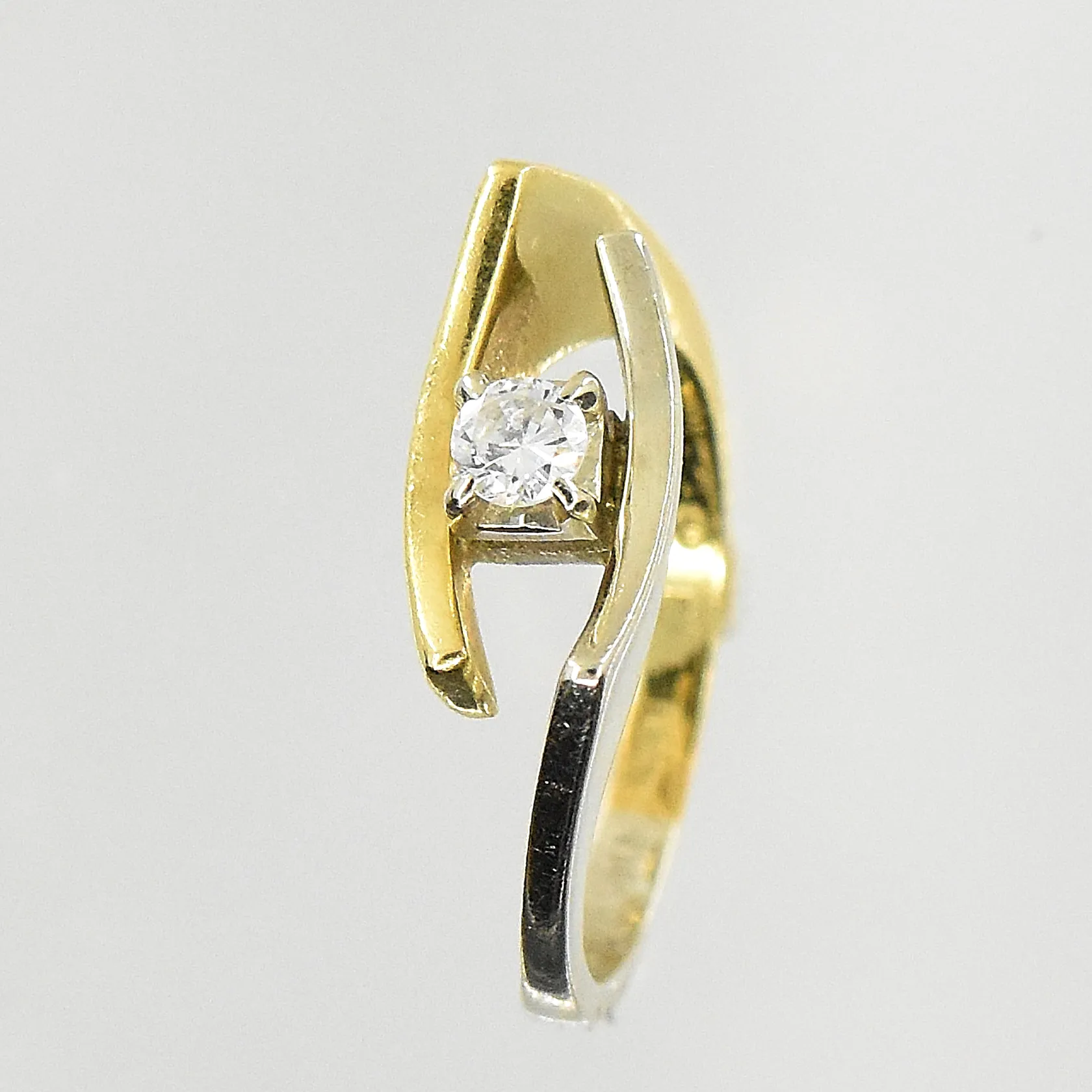 Ring med diamant ca 0,10ct, stl 14, bredd 2-6 mm, gulguld/vitguld, gravyr, 18K. Vikt: 2,6 g.