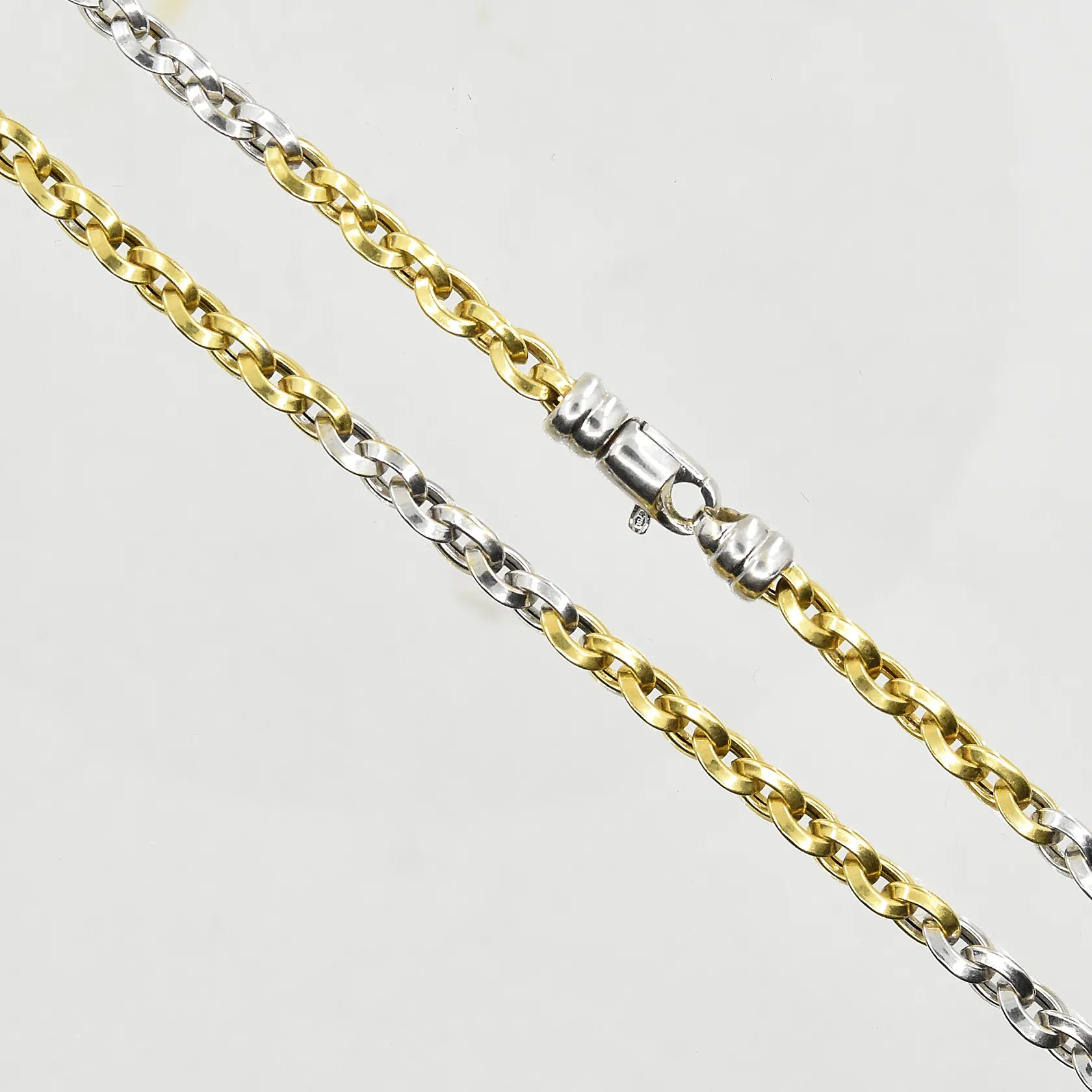 Kedja, längd 43½ cm, bredd 5 mm, gulguld/vitguld, 18K. Vikt: 16,3 g.