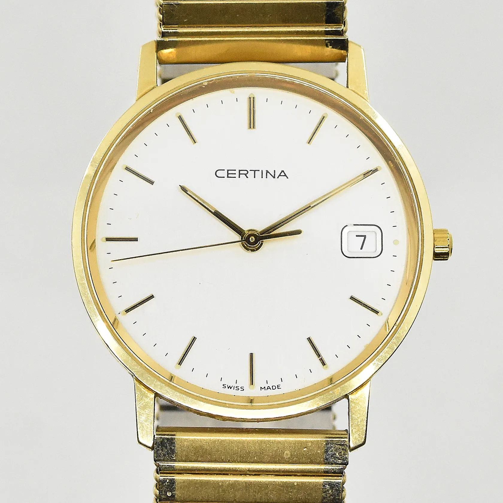 Herrur Certina 14K, boett Ø34 mm, quartz, datum, EOL 158.9289.65, graverad bakboett, flexband i doublé, behov av batteribyte, bruttovikt 45,5g.